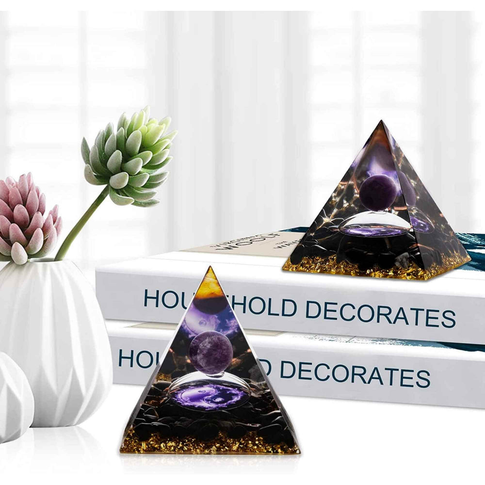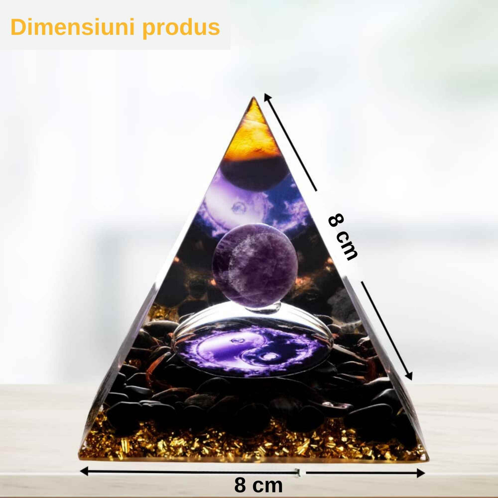 Această piramidă nu este doar un obiect de decor atrăgător, ci și un instrument eficient în transformarea energiei negative în energie pozitivă, fiind realizată din ametist de înaltă calitate, obsidian, foiță de aur și rășină naturală. Prin proprietățile ametistului, care nutrește sistemul nervos și stimulează creierul și creativitatea, combinat cu obsidianul, cunoscut pentru absorbția energiei negative și eliberarea celei pozitive, piramida devine un aliat în crearea unui mediu echilibrat și benefic.