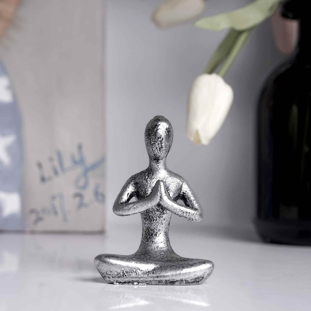 - Aceste statuete pentru meditatie Yoga sunt sclupturi cu material de rasina de inalta calitate si pictate in tehnica orientala. Fiecare sculptura pentru meditatie Yoga este acoperita cu culoarea argint antic si are un aspect rustic al unei sculpturi de meditatie;