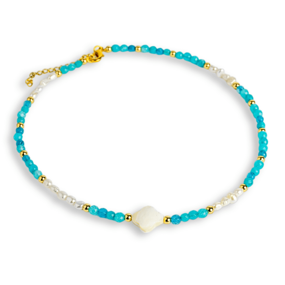 Colier tip choker cu pietre pentru pace interioara – Acvamarin, perle si simbol marin