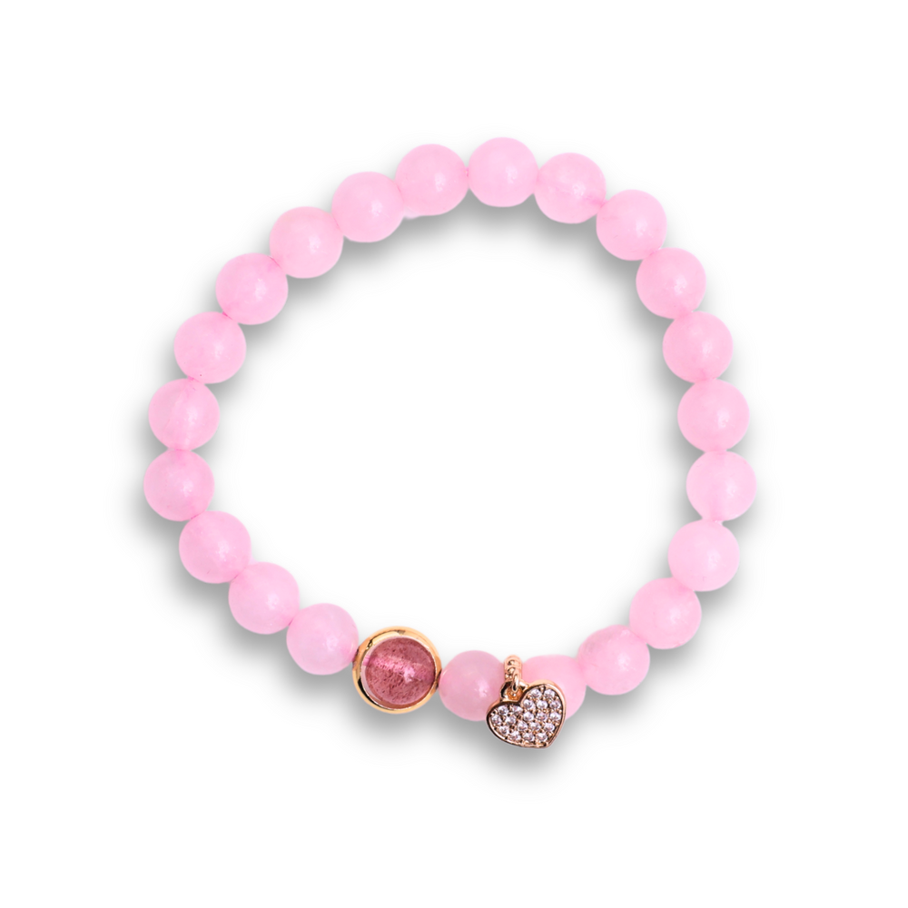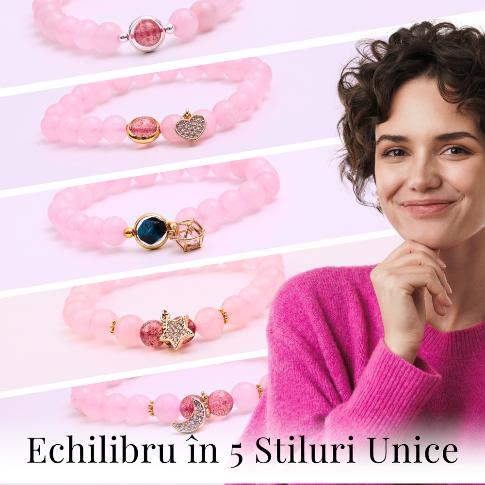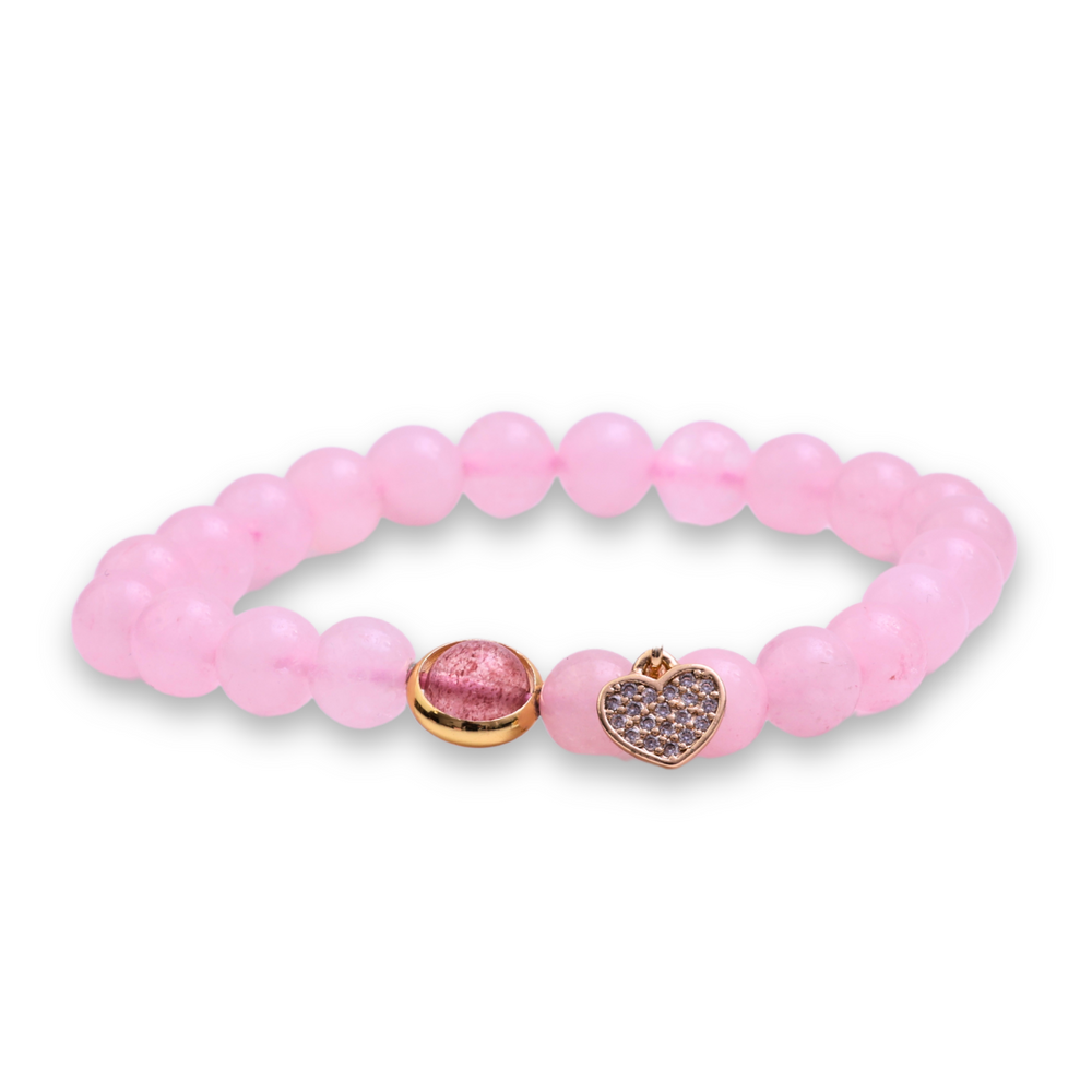 Aceasta bratara eleganta imbina margelele fine de cuart roz de 8 mm cu un pandantiv sferic si o inimioara delicata, fiind un accesoriu perfect pentru orice ocazie. Cuartul roz este cunoscut pentru proprietatile sale de a aduce iubire si armonie.