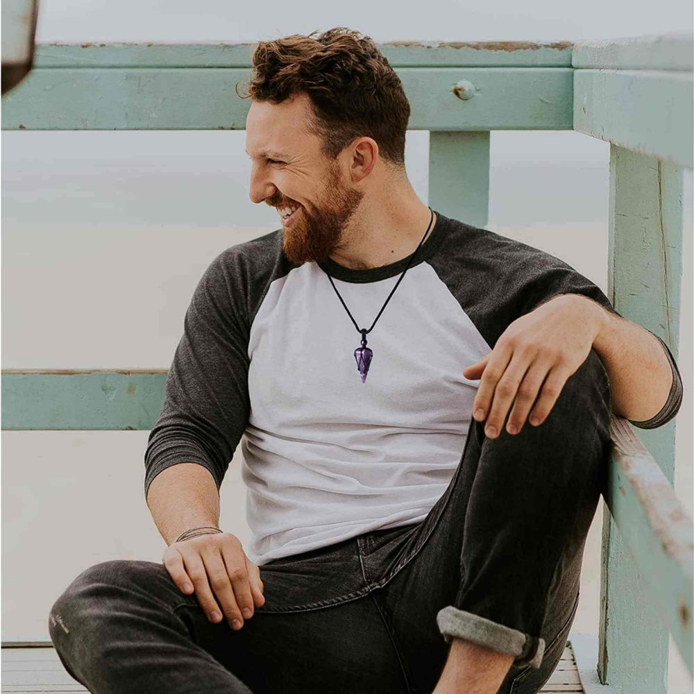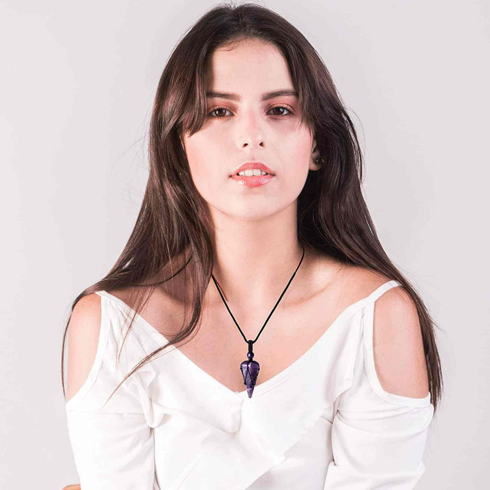 Acest colier prezintă un pandantiv finisat cu șase fațete, creat meticulos din cristal natural de Ametist, completat de o frânghie reglabilă. Ametistul, recunoscut ca o piatră de o puternică protecție, nu doar că păzește împotriva atacurilor psihice, transformând energia negativă în dragoste, dar și protejează purtătorul de diverse forme de vătămări, incluzând stresul geopatic sau cel electromagnetic.