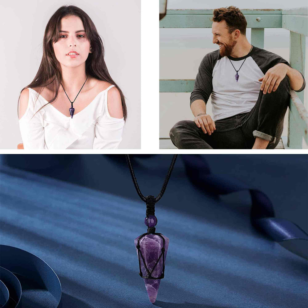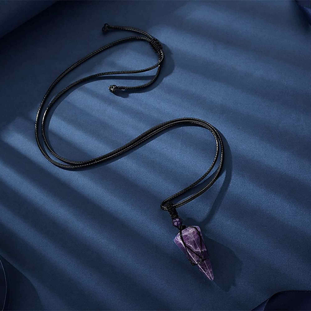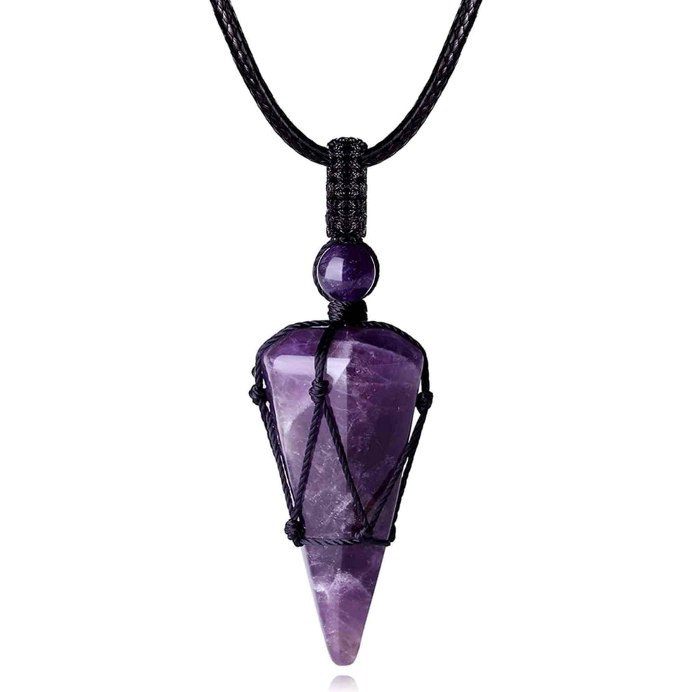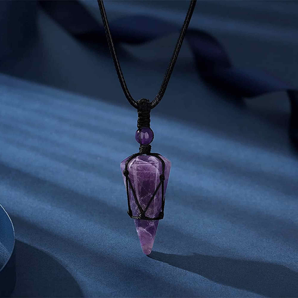 Colier cu cristal vindecator Ametist, cu 6 fatete si franghia impletita – pentru pace interioara, calm si reducerea stresului