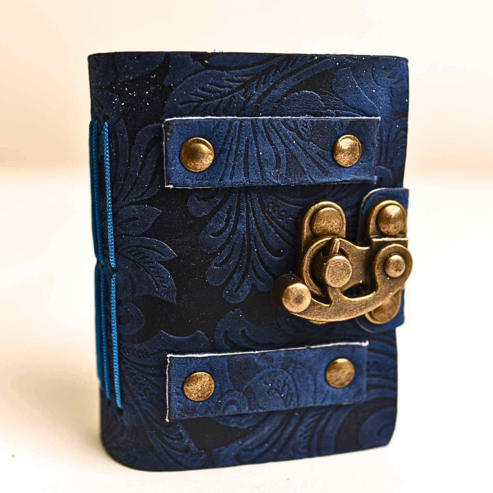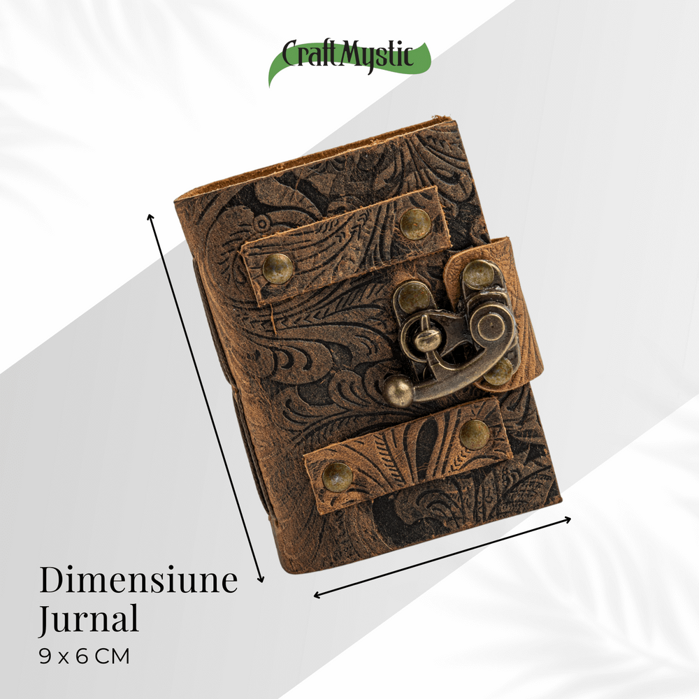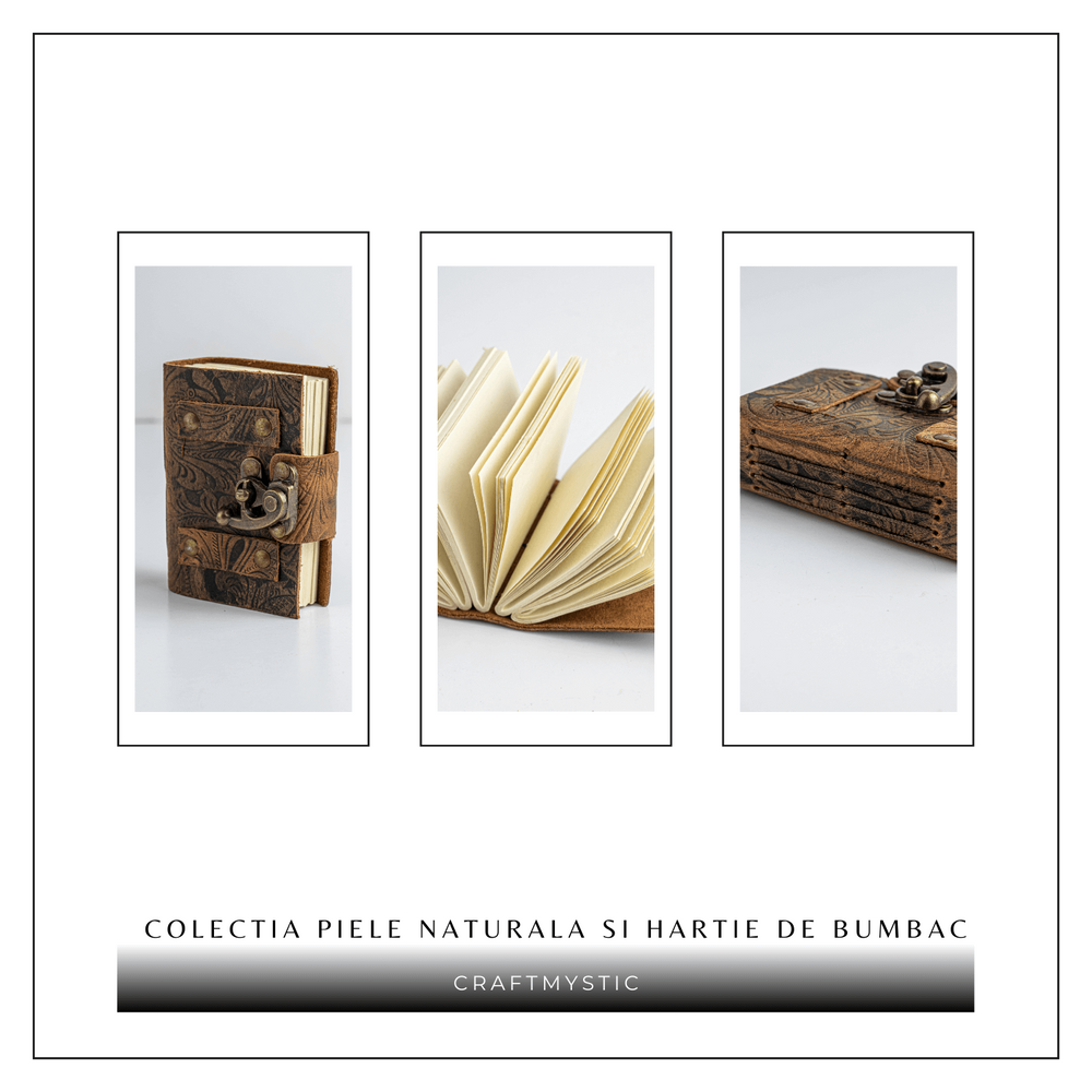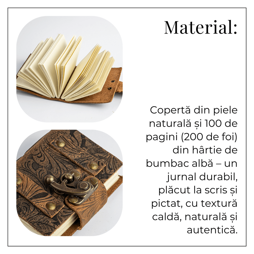 • Coperta lucrata manual din piele naturala, cu inchidere metalica vintage