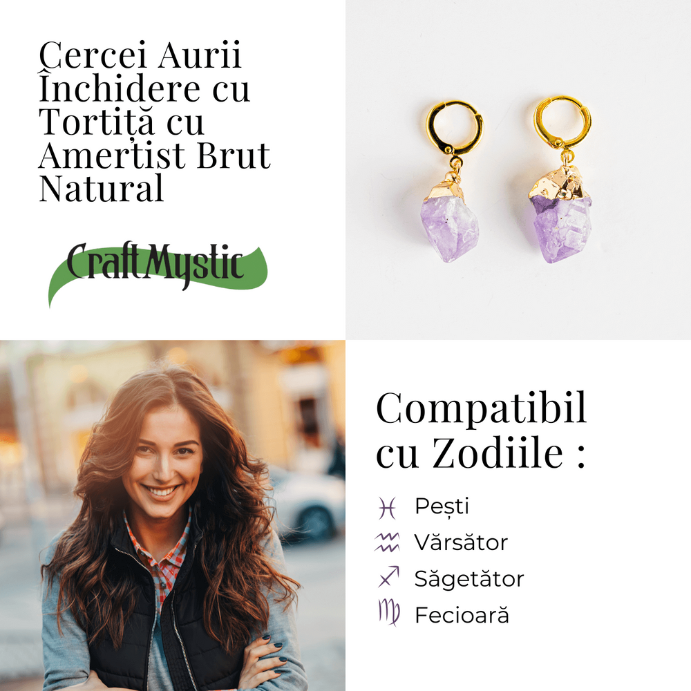 Transformă-ți stilul și echilibrează-ți energia cu acești cercei aurii cu Ametist Brut Natural. Adaugă-i acum în coșul tău și lasă magia Ametistului să îți protejeze fiecare zi!