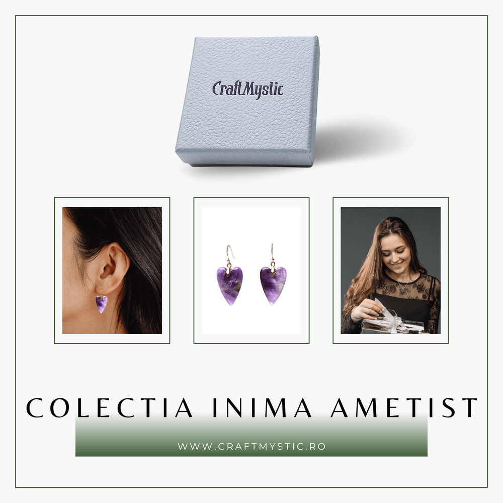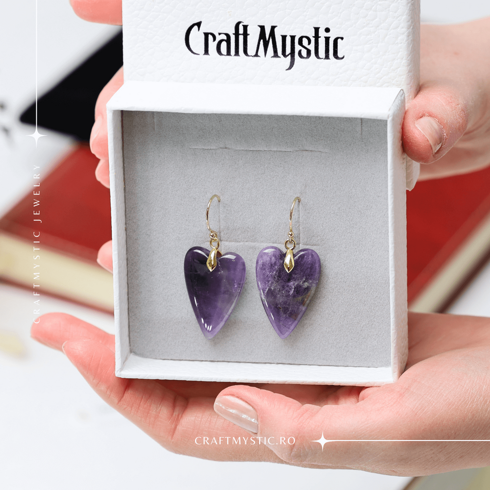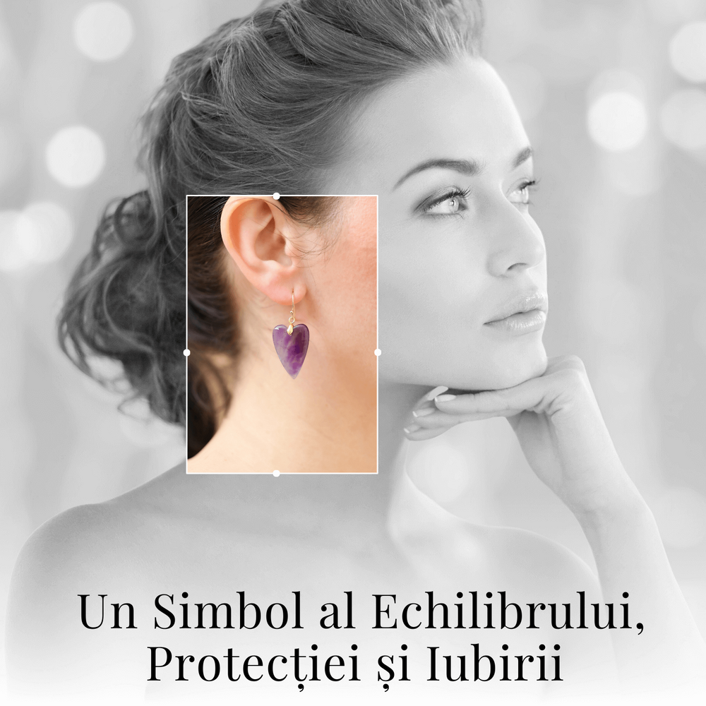 Acesti cercei stralucitori, in forma de inima, sunt impodobiti cu cristale de ametist de inalta calitate, oferind o combinatie perfecta de lux si sentiment.
