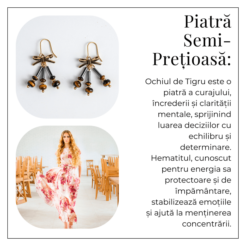 Acești cercei sunt o expresie a stabilității și forței interioare. Hematitul este recunoscut pentru capacitatea de împământare și echilibru mental, iar Ochiul de Tigru oferă curaj, protecție și motivație. Împreună, formează o bijuterie care susține rezistența emoțională și protejează împotriva influențelor negative.