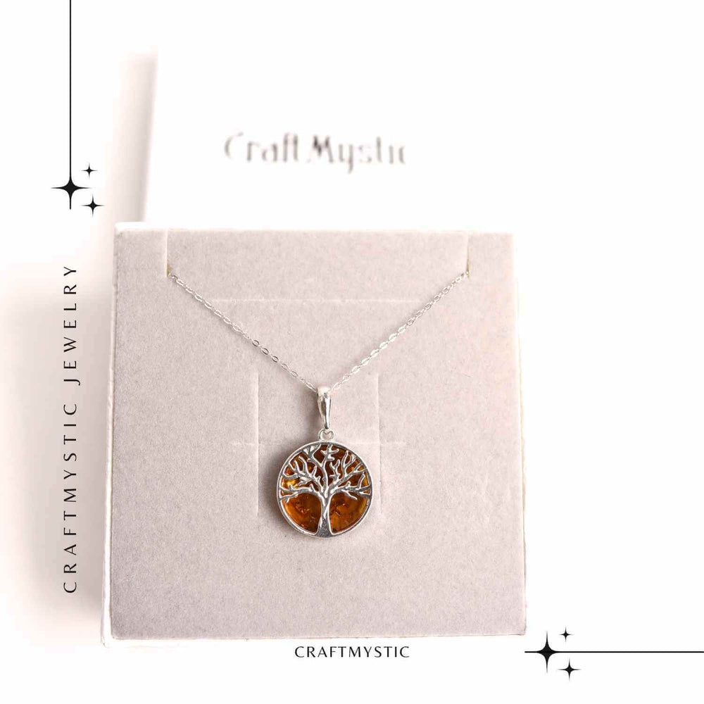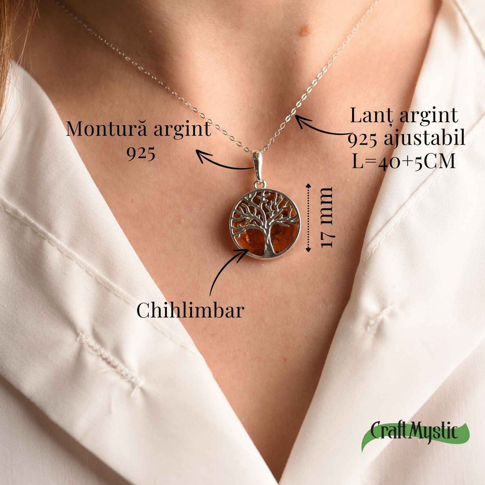 Colier din argint 925 cu piatră naturală de chihlimbar, în formă rotundă cu copacul vieții: Acest colier elegant combină energia protectoare și vindecătoare a chihlimbarului cu simbolismul profund al copacului vieții. Pandantivul de aproximativ 17 mm și lanțul ajustabil (40+5 cm) oferă un design versatil, ideal pentru orice ocazie. Fiecare piesă este lucrată manual, având variații subtile care subliniază unicitatea produsului.