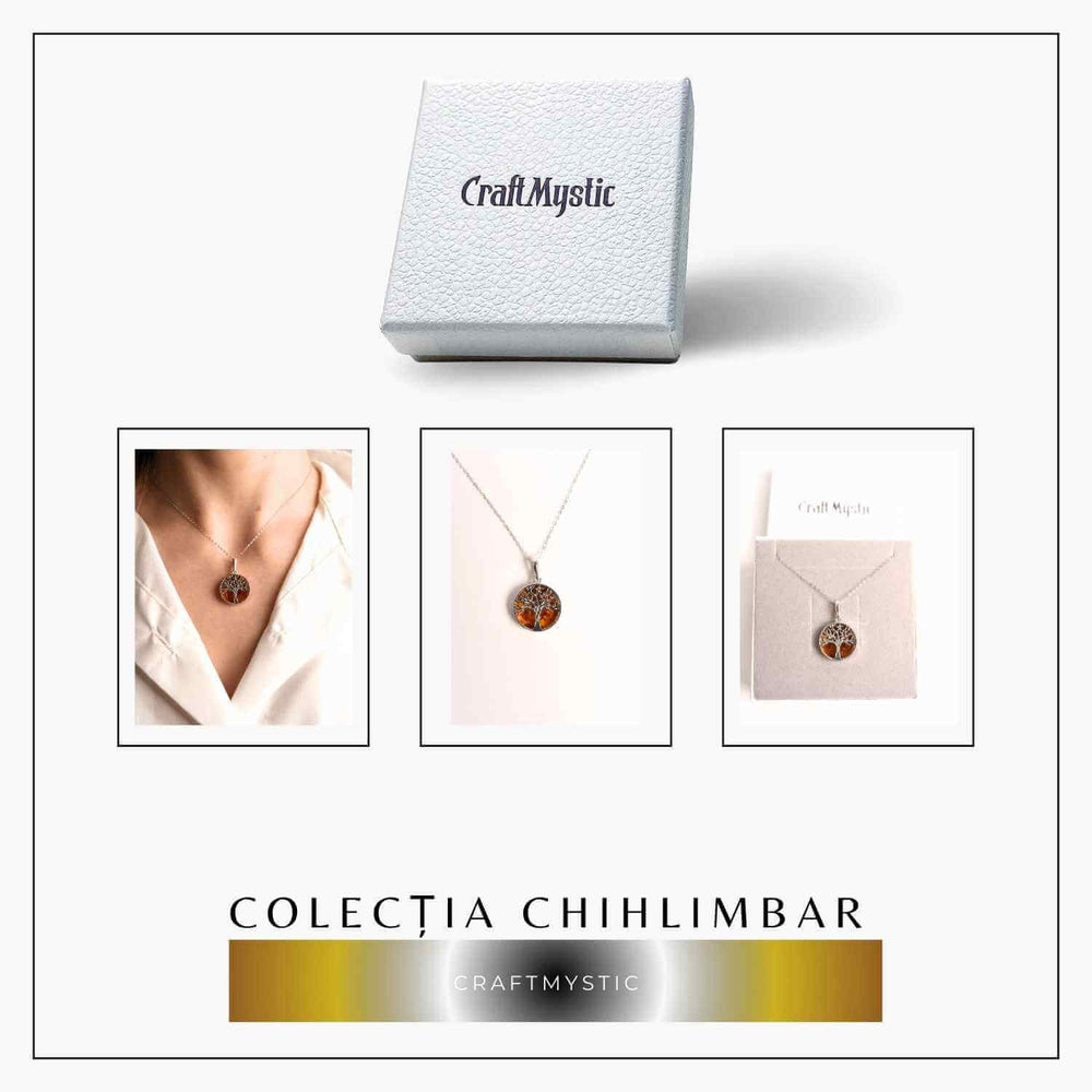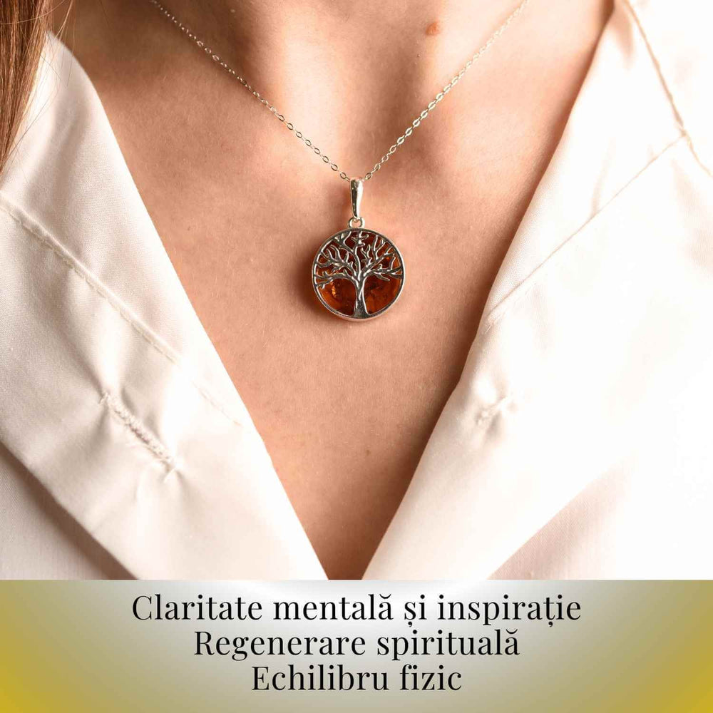 Un colier absolut unic, cu pandantiv în formă rotundă și copacul vieții, realizat din chihlimbar natural și argint 925 – simbol al echilibrului și regenerării.