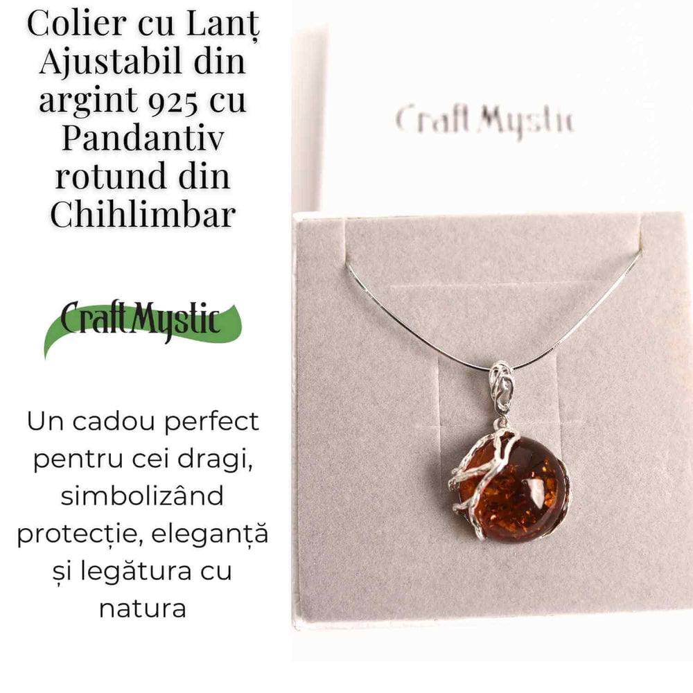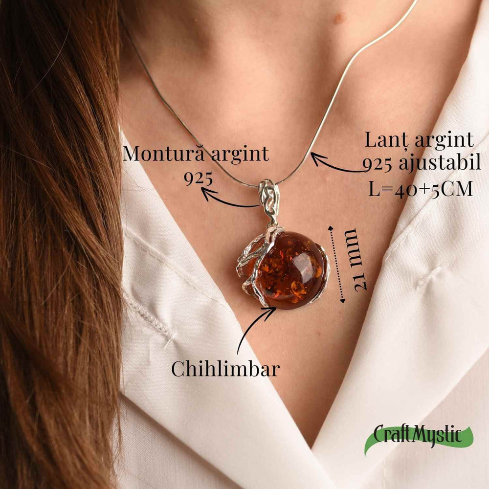 Un colier incredibil de elegant, cu pandantiv rotund din chihlimbar natural și argint 925 – simbol al rafinamentului și protecției.
