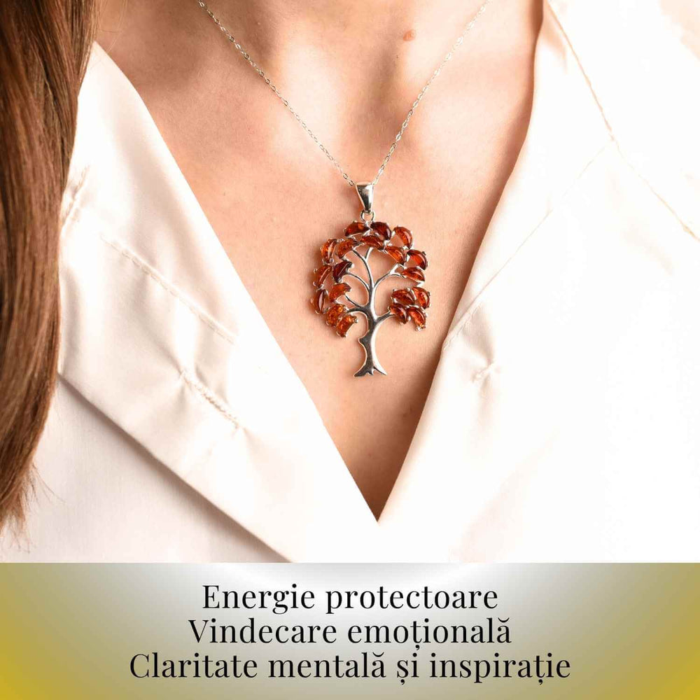 Un colier unic cu pandantiv în formă de copacel, lucrat manual din chihlimbar natural și argint 925 – simbol al echilibrului și regenerării.