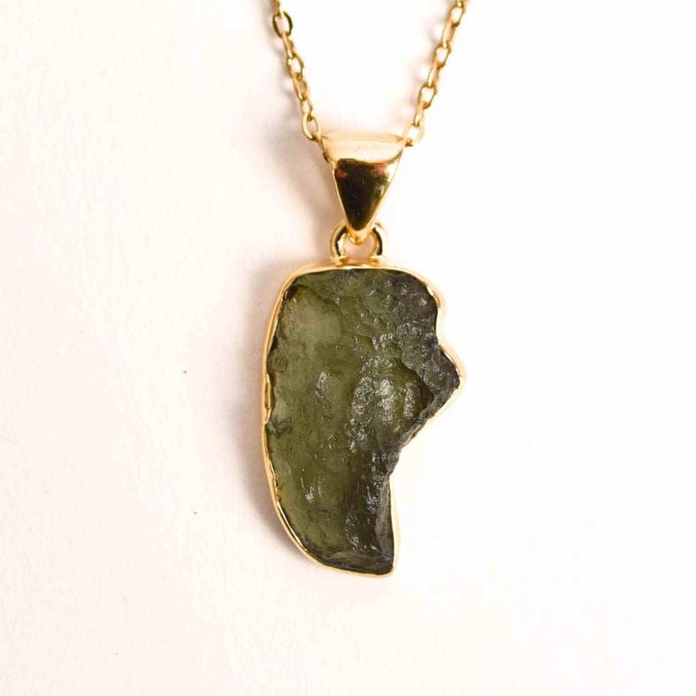 Colier cu lant de inox aurit si pandantiv montura argint 925, placat cu aur 18 k si Moldavit natural, 2.55 gr – Protectie si transformare