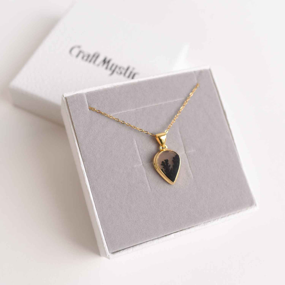 Un colier rafinat și profund, cu lanț inoxidabil și montură din argint 925 placat cu aur de 18k, în care Agatul Dendritic devine o veritabilă operă de artă naturală. Peisajul mineral unic din interiorul pietrei amintește de siluete de copaci sau crengi, conectându-te cu energia Pământului și cu propria ta rădăcinare emoțională.