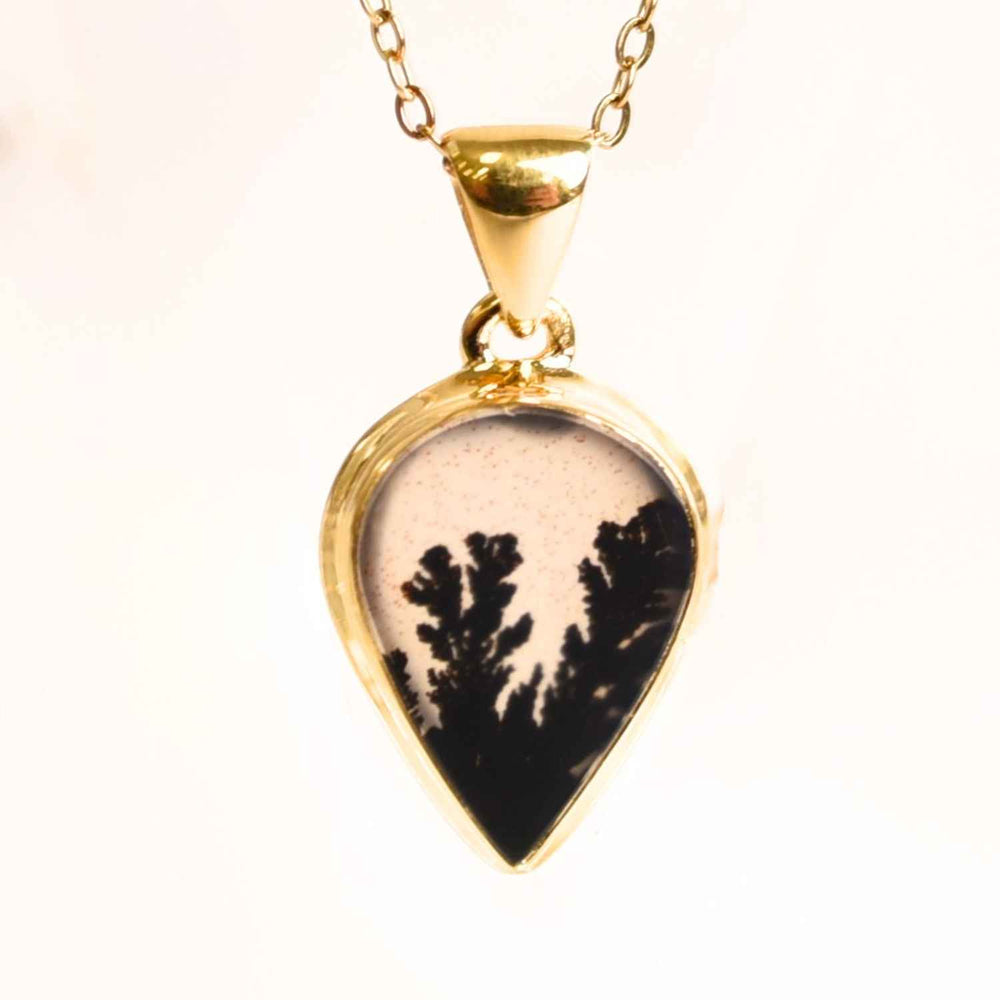 Colier lant inox cu pandantiv montura pe argint 925 placat cu aur 18k si Agat Scenic Dentritic - Claritate si echilibru emotional