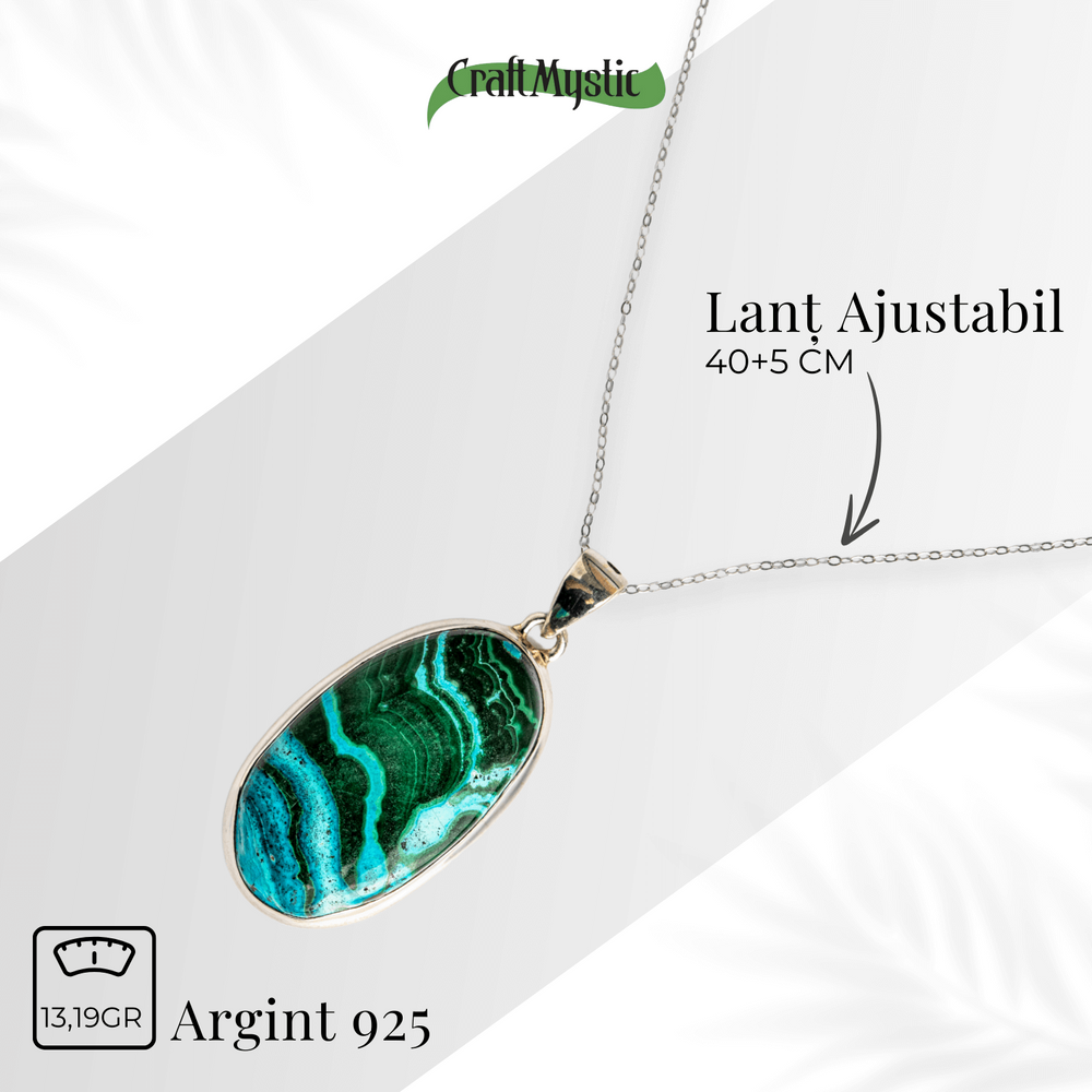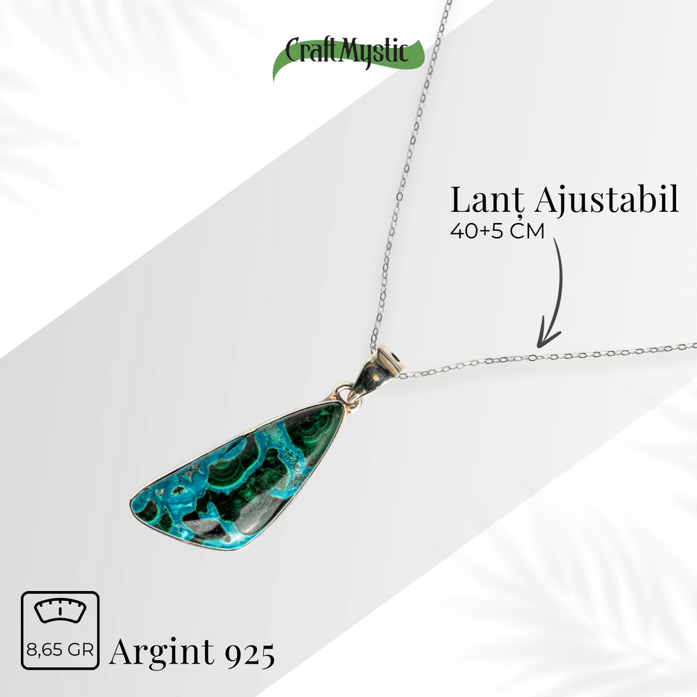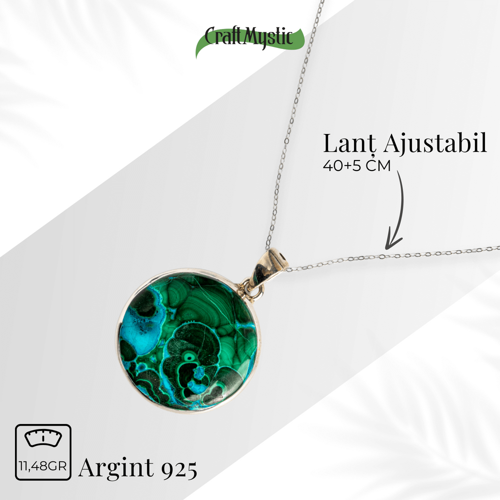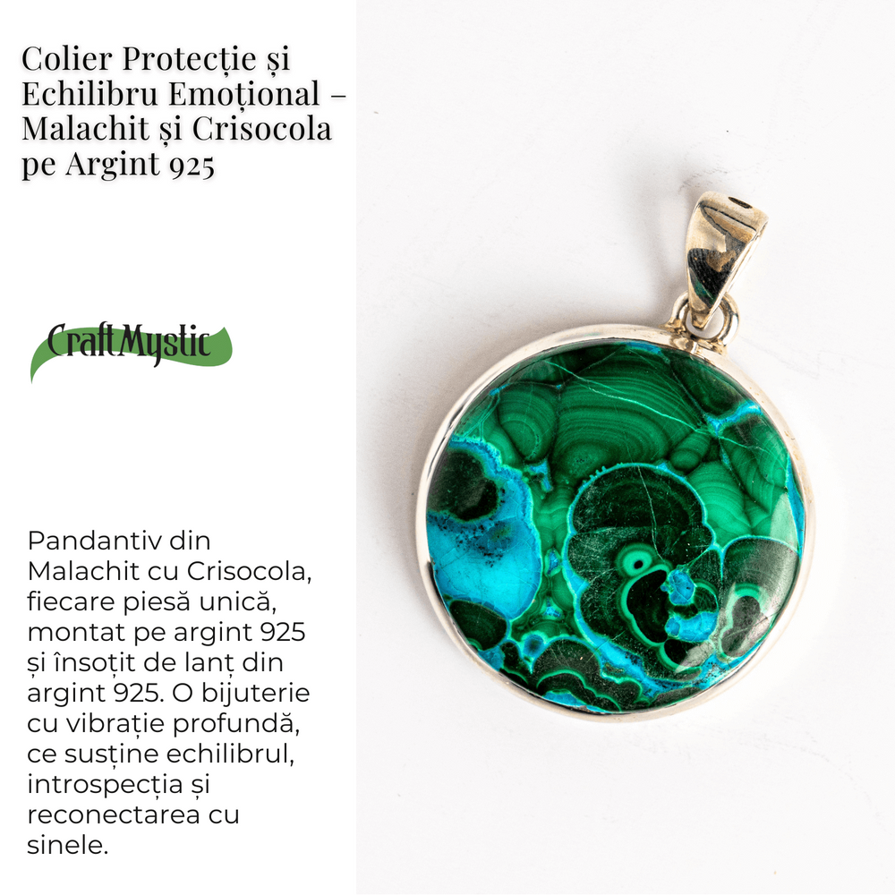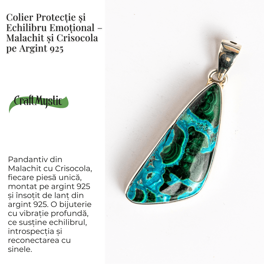Acest colier nu este doar un accesoriu, ci un talisman energetic. Combinația de Malachit și Crisocola este recunoscută pentru echilibrarea inimii, deschiderea către compasiune, dar și pentru protecție subtilă față de energii negative.