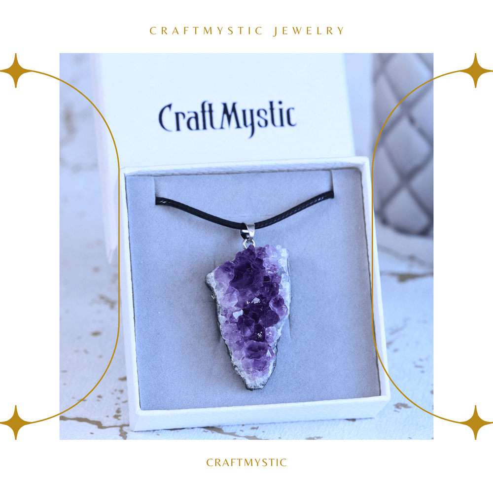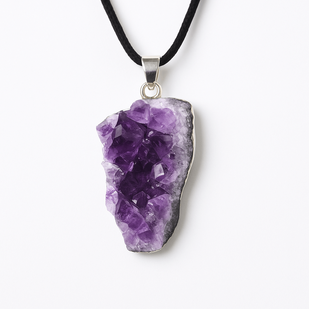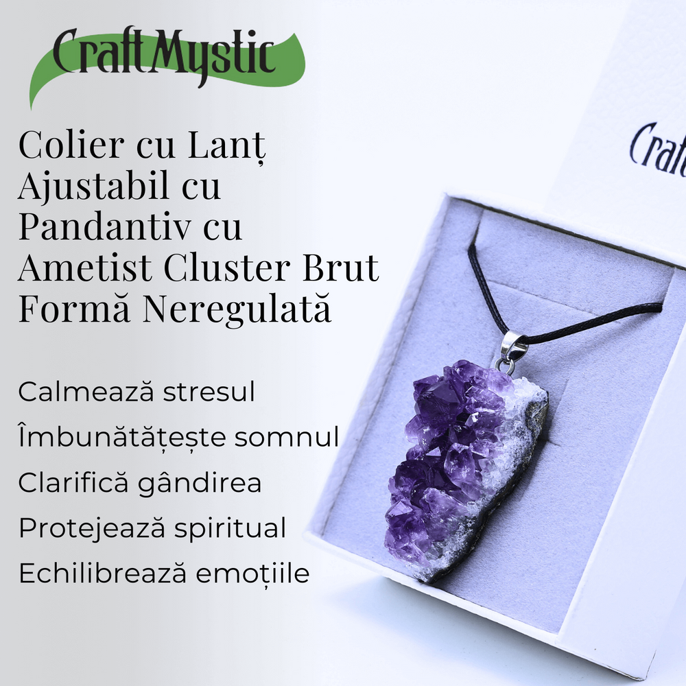 Acest colier elegant, realizat manual, cu pandantiv din Ametist cluster brut, este alegerea perfectă pentru cei care apreciază bijuteriile cu semnificație profundă și un stil autentic. Ideal pentru aniversări, sărbători sau orice ocazie specială, acest colier simbolizează calmul, claritatea mentală și protecția spirituală.