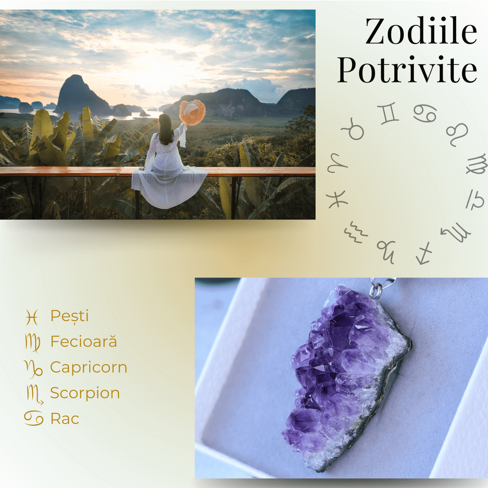 Ametistul este o piatră potrivită pentru zodiile Pești, Vărsător și Săgetător. Aceasta susține calmul emoțional, protecția spirituală și claritatea mentală, fiind un talisman ideal pentru cei născuți sub aceste semne zodiacale.