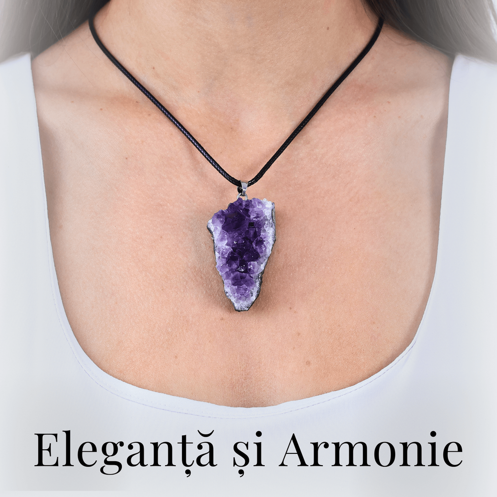 Fiecare piatră de Ametist este lucrată manual, ceea ce face ca fiecare colier să fie unic. Pot exista mici diferențe de culoare și textură față de imaginile prezentate, oferind fiecărei piese un farmec distinctiv și autentic. Produsul va fi livrat într-un săculeț de catifea sau o cutie cadou, gata pentru a fi oferit.