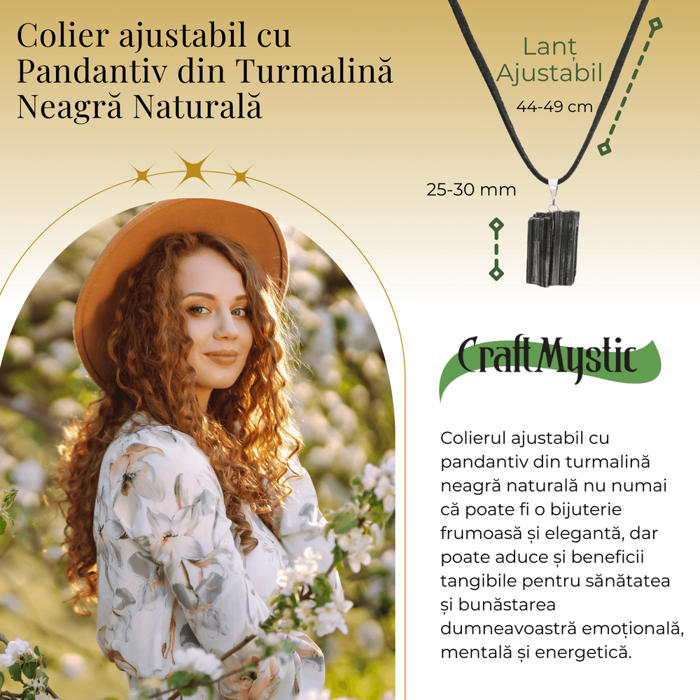 Descriere: Descoperiți eleganța și puterea cu acest colier ajustabil, având un pandantiv spectaculos din Turmalină Neagră naturală. Fiecare piesă, cu dimensiuni între 25-30mm, este unică, reflectând frumusețea și misterul naturii.