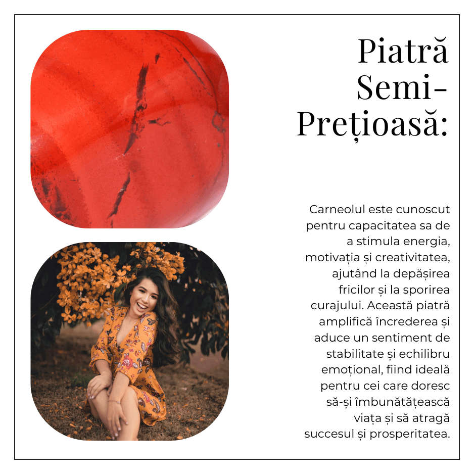 - Vitalitate și energie pozitivă: Carneolul este cunoscut pentru capacitatea sa de a stimula energia fizică și de a îmbunătăți starea generală de bine.