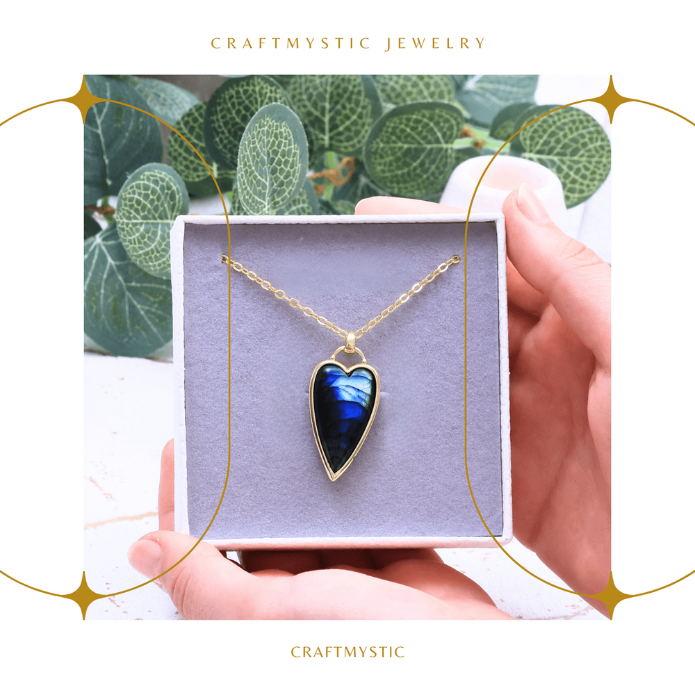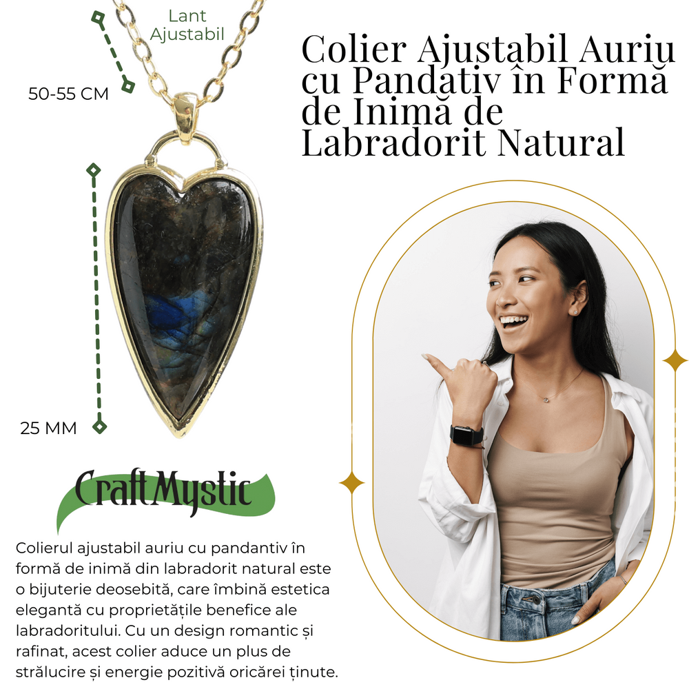 Strălucire și Energie Pozitivă cu Colierul Labradorit Natural Colierul nostru auriu ajustabil cu pandantiv din labradorit natural în formă de inimă este perfect pentru cei care caută un accesoriu elegant și plin de semnificație. Acest colier unic nu doar că adaugă o notă de rafinament ținutelor tale, dar oferă și beneficii energetice datorită pietrei de labradorit.