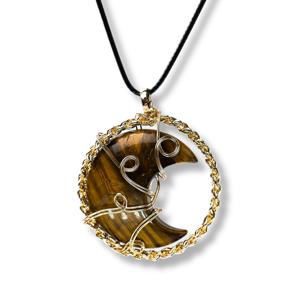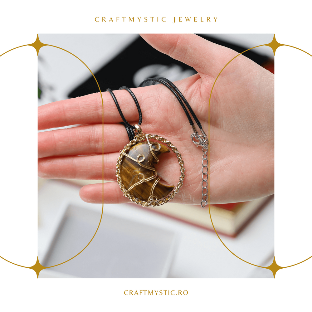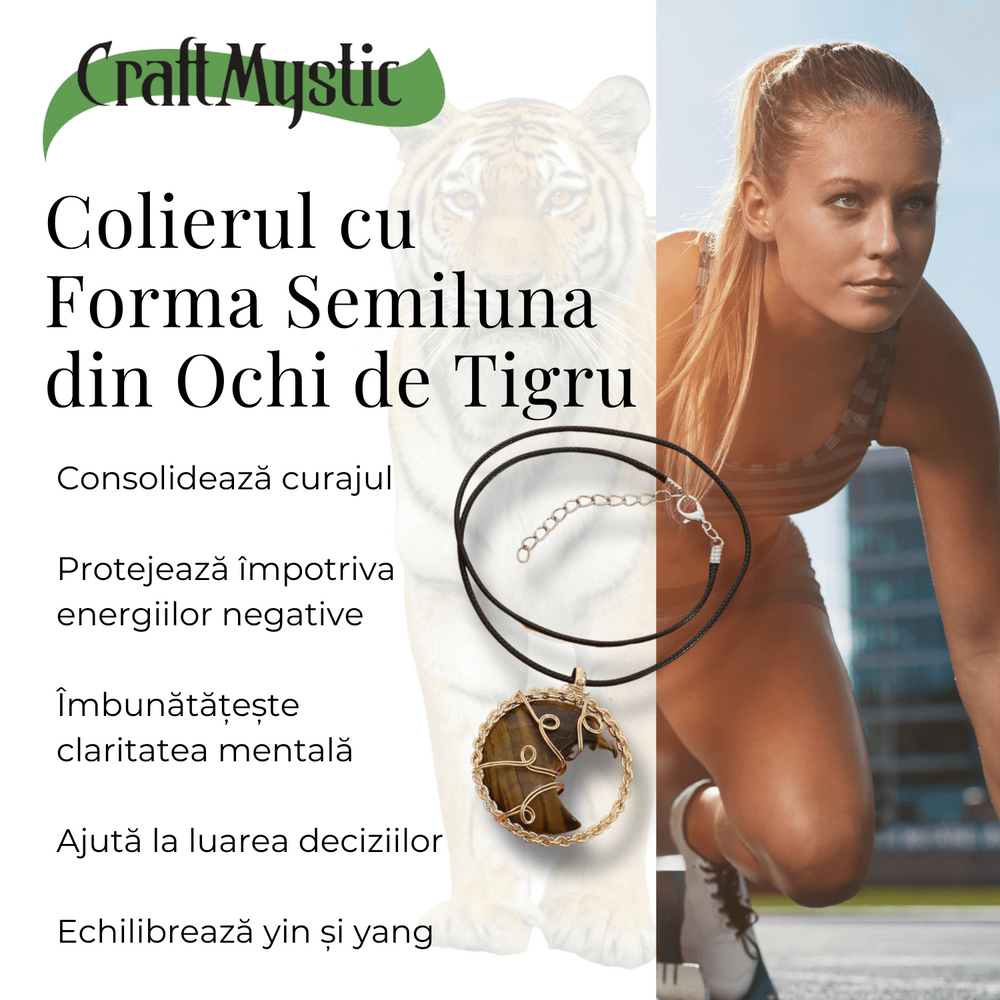 Acest colier auriu prezinta un design unic in forma de semiluna, accentuat cu un frumos cristal Ochi de Tigru, combinand eleganta cu un stil contemporan.