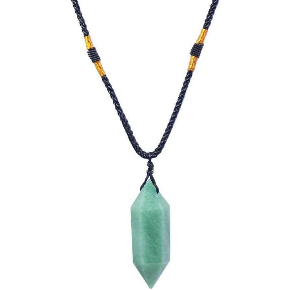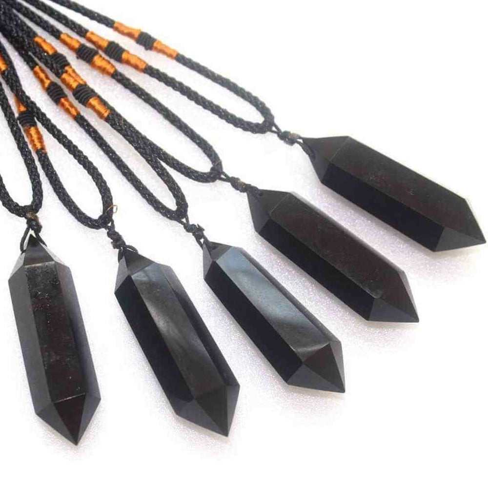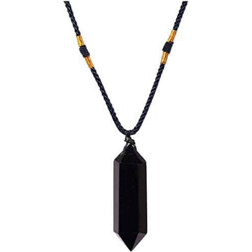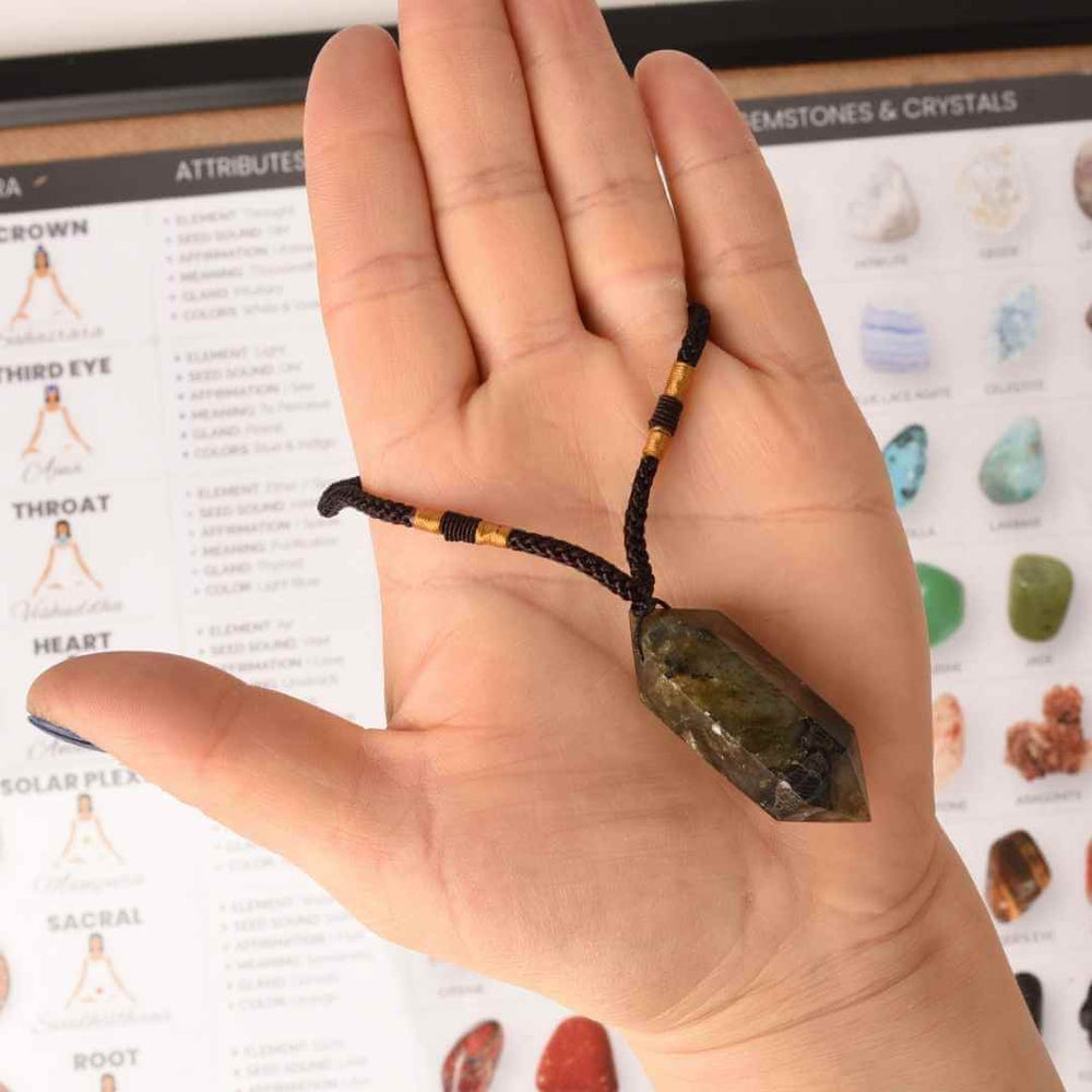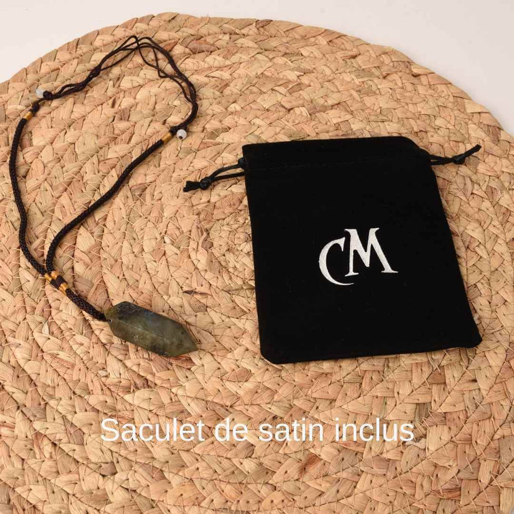 Colier cu cristal vindecator Labradorit 4-5 cm, in forma hexagonala cu dublu varf si saculet satin negru – pentru protectie, vointa si noroc