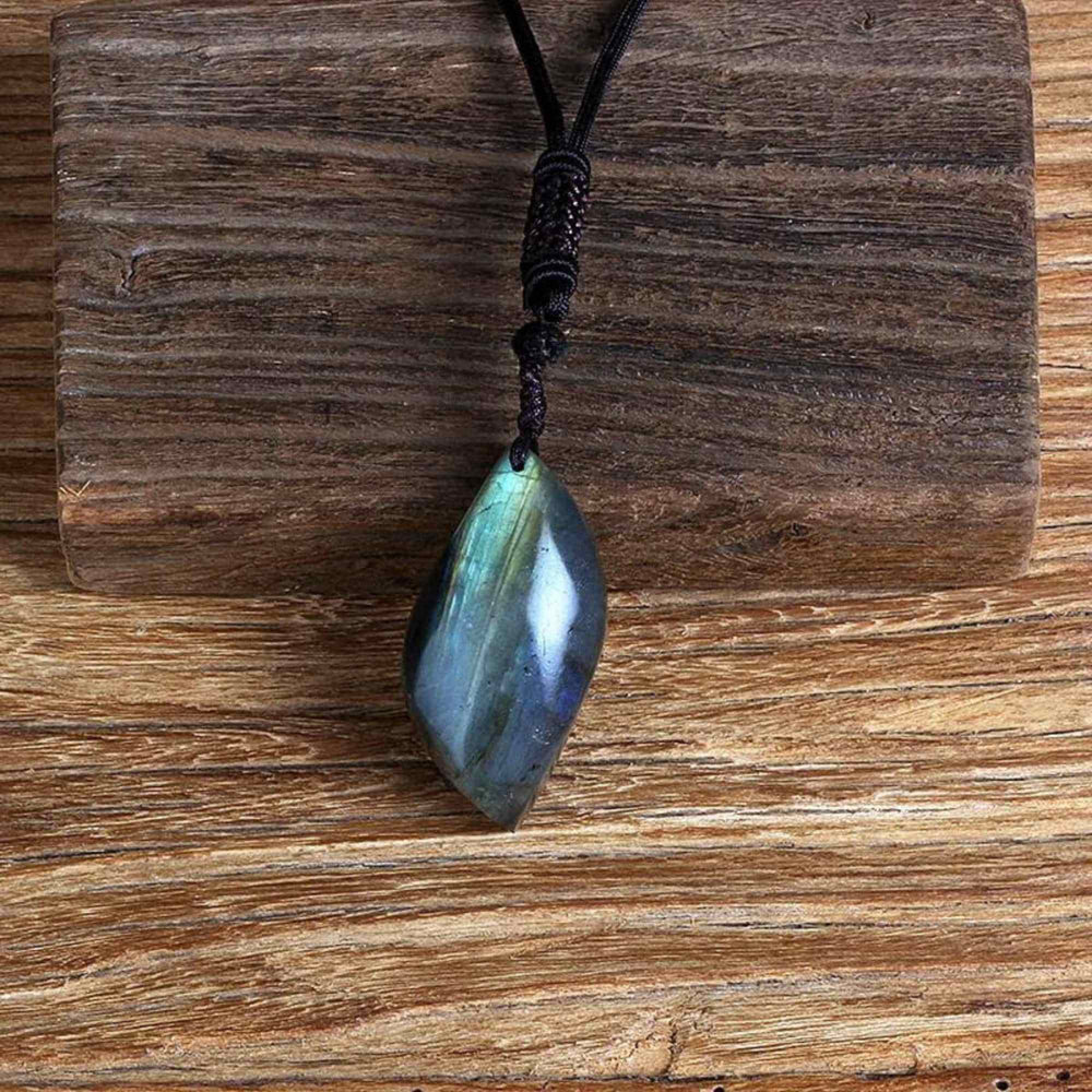 Acest colier cu labradorit este atent sculptat intr-o forma atragatoare de "Strop de ploaie", combinand eleganta cu energia naturala a pietrei.