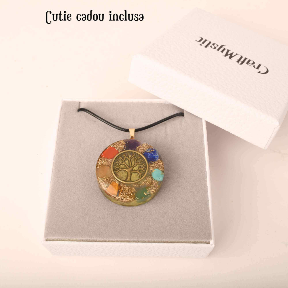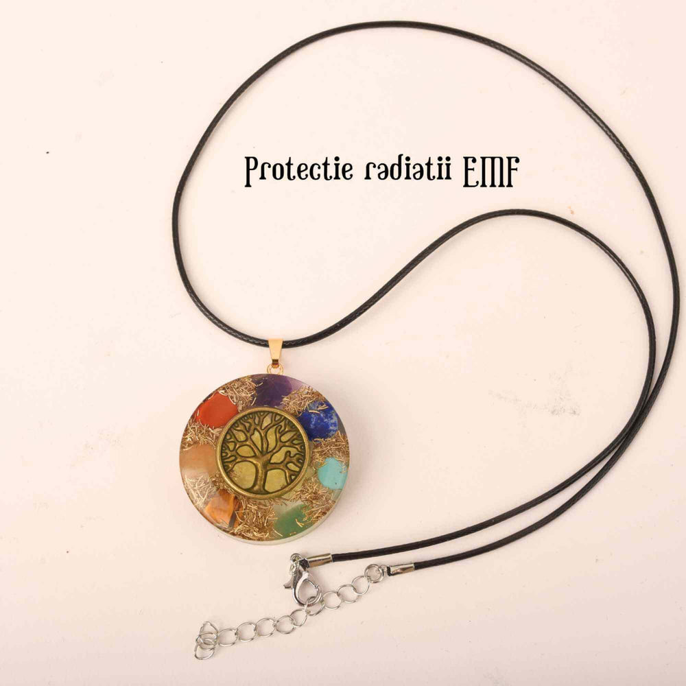 • Un colier cu un pandantiv de 35 mm, confecționat din cupru și încărcat cu energie orgonică, având un Arbore al Vieții și pietre naturale reprezentând cele șapte chakre.