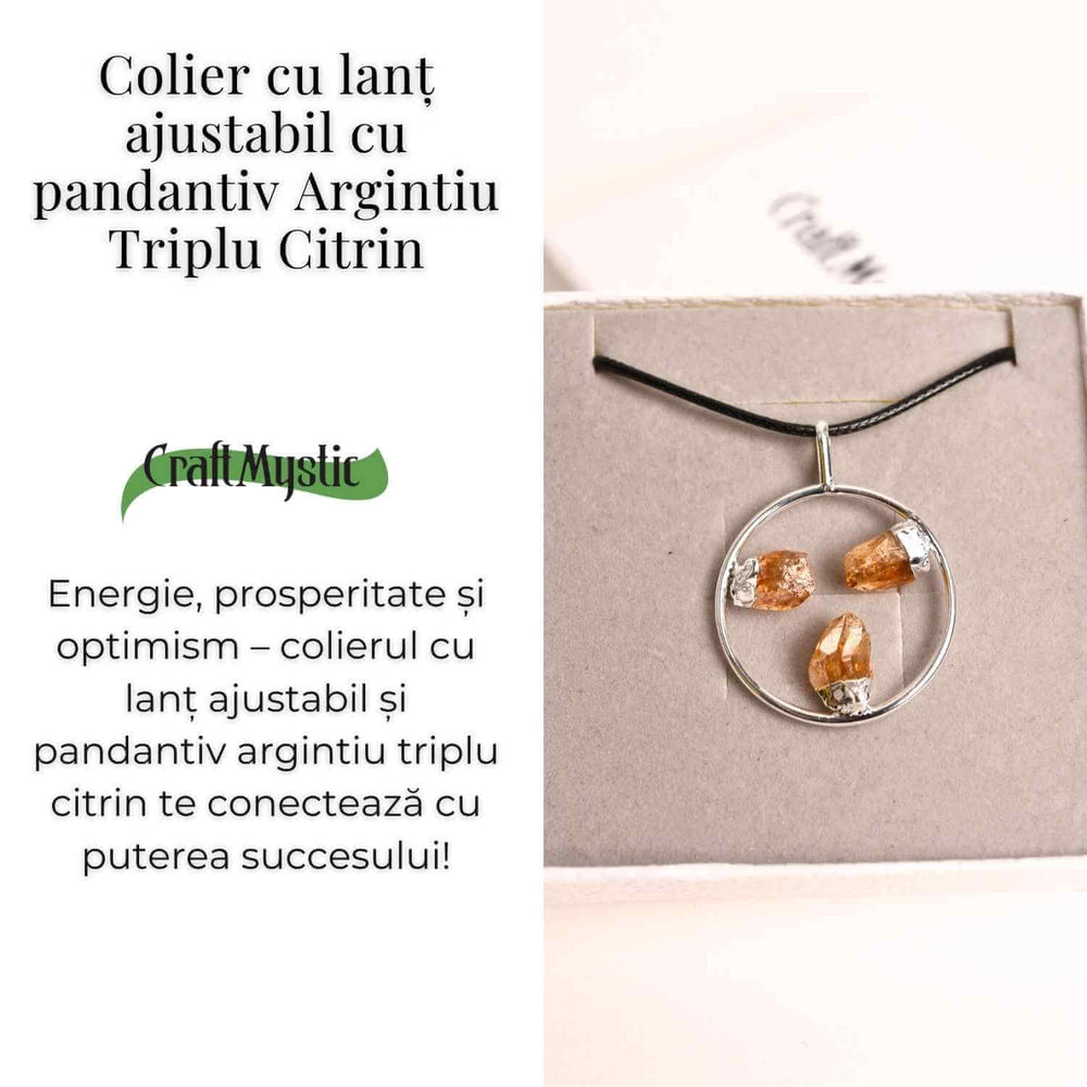 Acest colier cu pandantiv rotund, decorat cu 3 pietre naturale de Citrin, este realizat manual, utilizând alamă combinată cu cupru, placată argintiu pentru protecție împotriva oxidării. Un accesoriu ideal pentru cei care doresc să poarte un simbol al prosperității și al energiei pozitive.