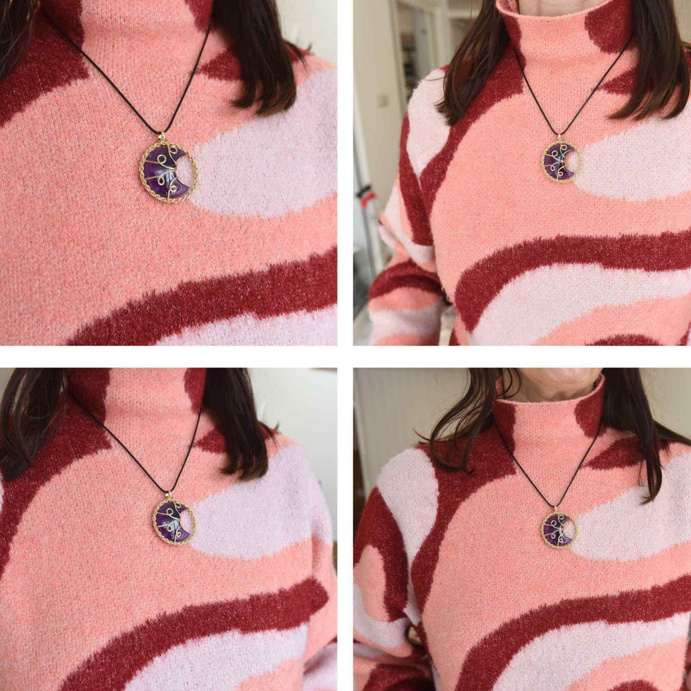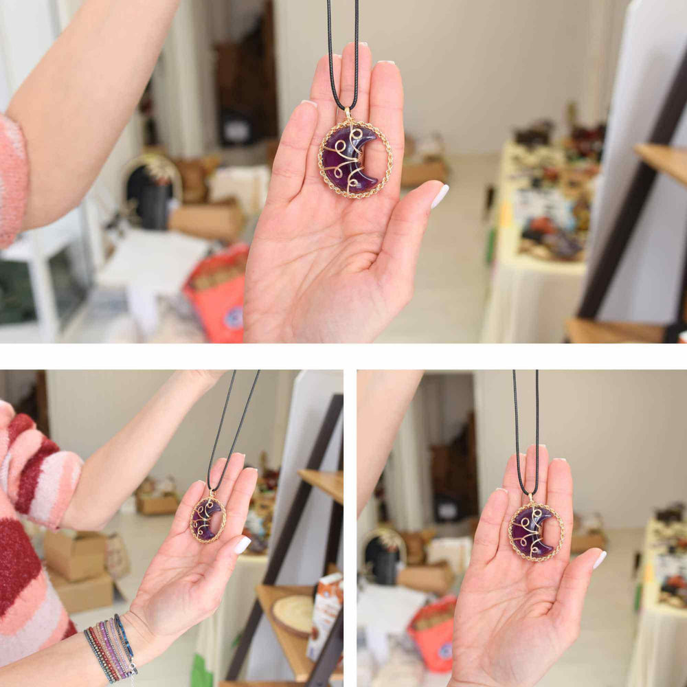 Colier cu pandativ auriu si semiluna din rasina naturala cu piatra de ametist este în așteptare și va fi expediat de îndată ce este din nou în stoc.