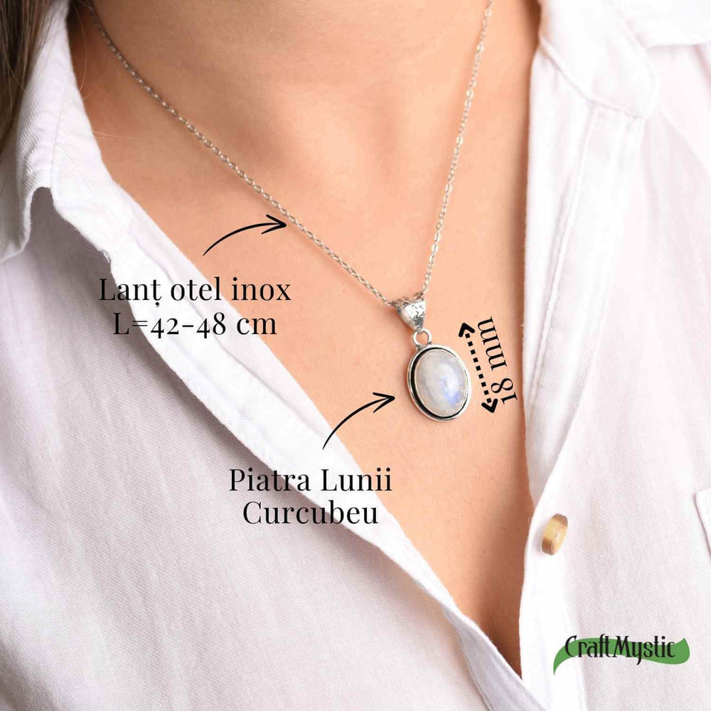 Detalii tehnice: Piatra Lunii Curcubeu naturală, dimensiune aproximativ 18 mm, montată manual într-un pandantiv metalic rezistent. Lungimea ajustabilă a colierului din oțel inoxidabil este de 42-48 cm, potrivită pentru orice ținută.