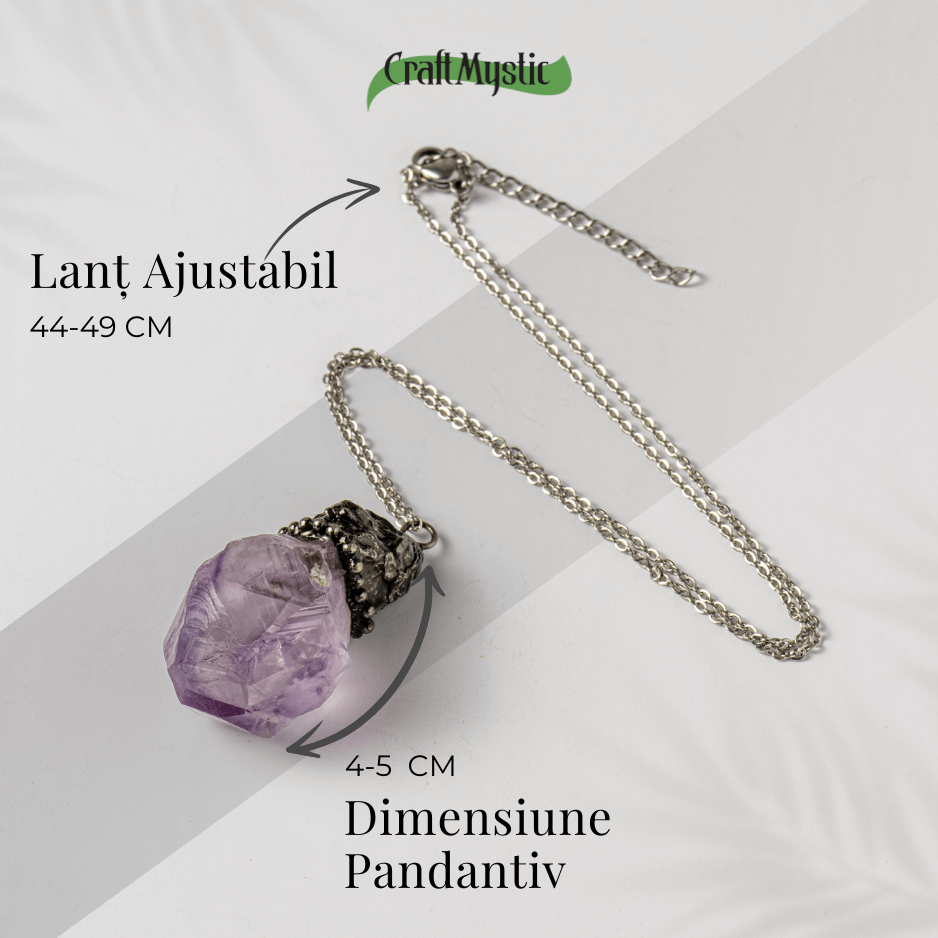 Acest colier vintage cu pandantiv din ametist brut simbolizează puritatea, protecția și echilibrul. Ametistul brut păstrează energia sa naturală neprelucrată, amplificându-i proprietățile de vindecare și protecție spirituală.