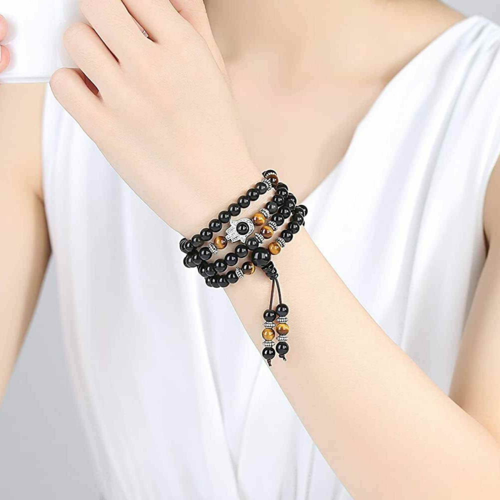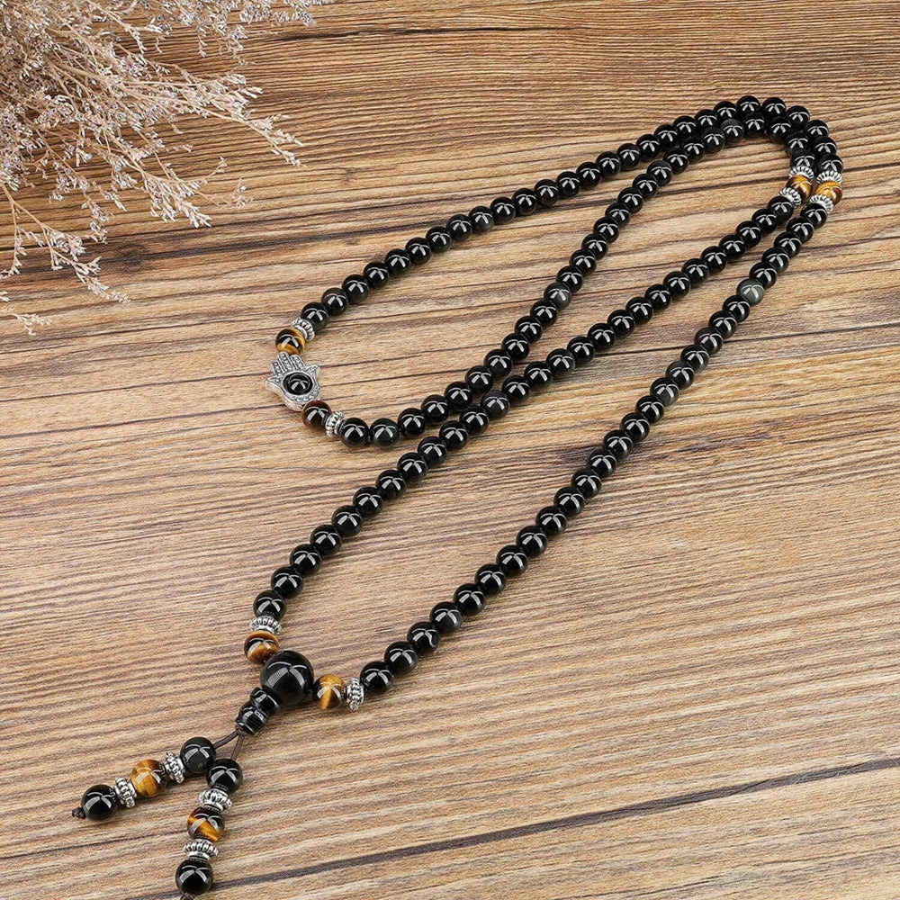 Dubla utilizare Bratara/Colier 108 Mala din Obsidian si Ochi de Tigru cu Mana Fatimei sau Hamsa