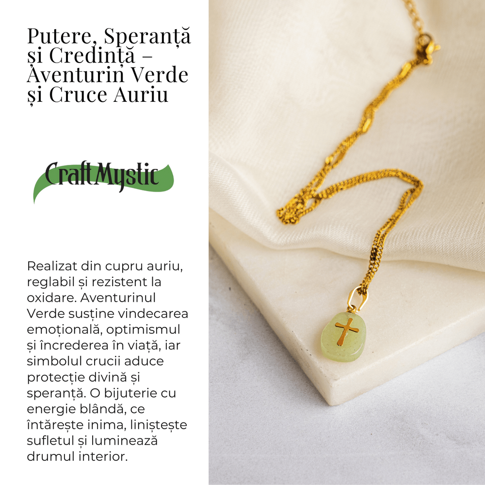 Descoperă secretul unei vieți echilibrate și pline de speranță cu un colier absolut unic, realizat manual, care combină puterea aventurinului verde cu simbolul sacru al credinței – crucea.