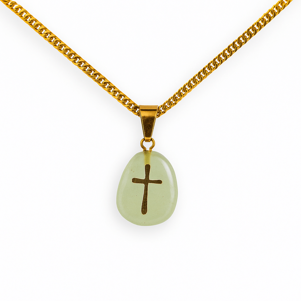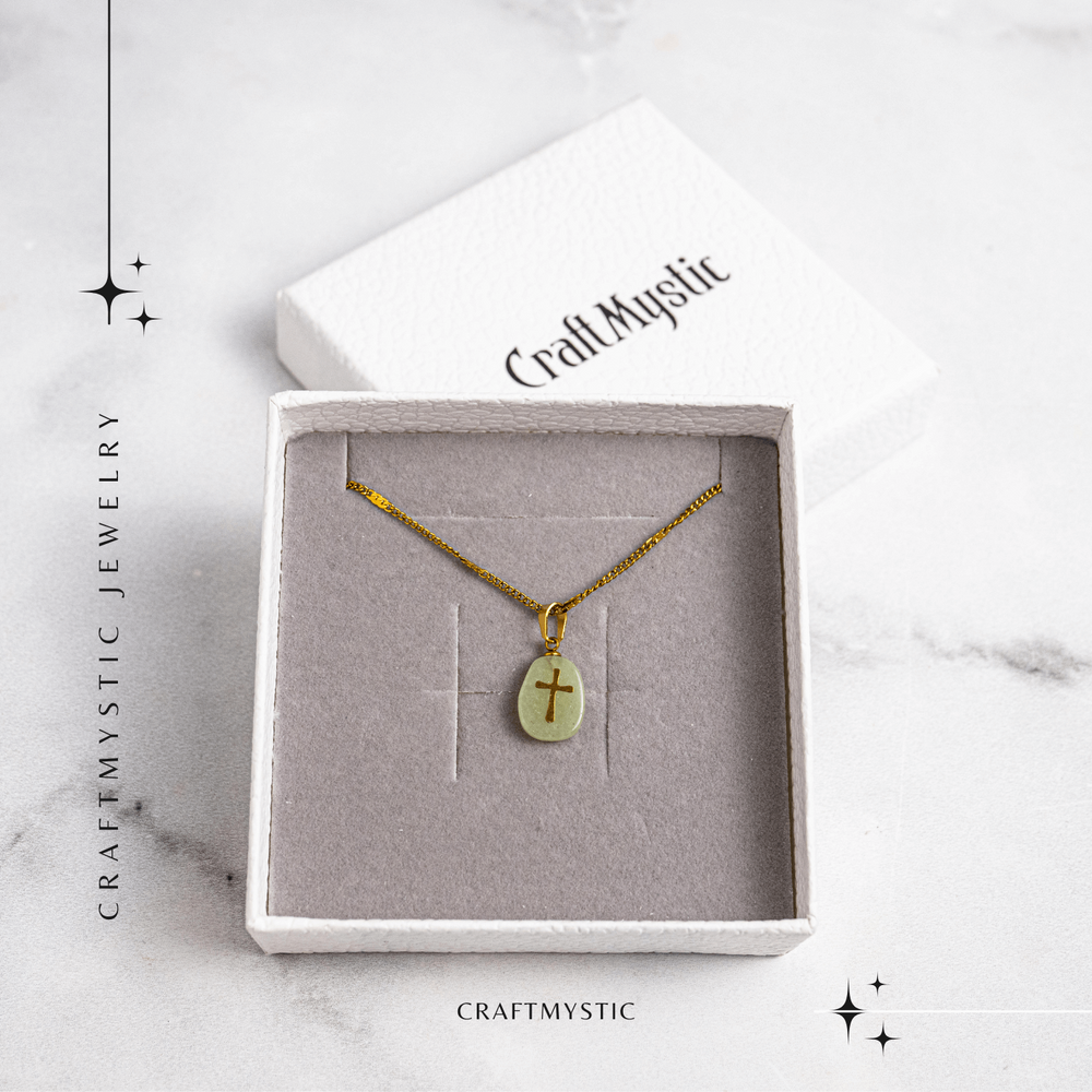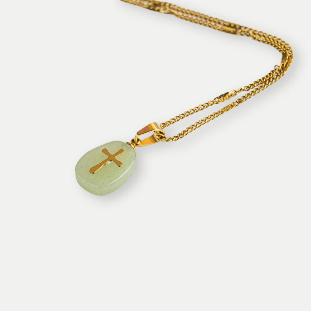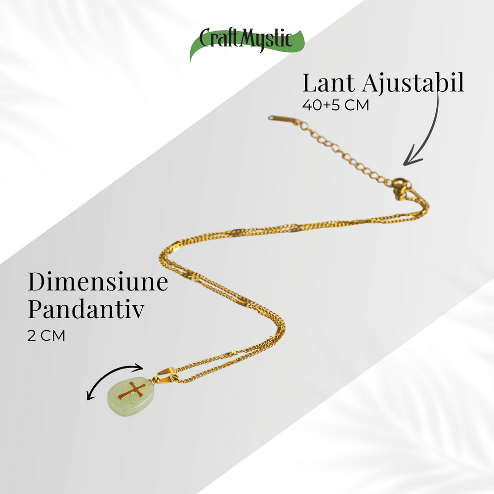 Aventurinul verde este cunoscut ca „piatra oportunității” – atrage succesul, stimulează regenerarea emoțională și aduce o stare generală de bine. Crucea aurie simbolizează protecția divină, credința și lumina interioară. Împreună, acestea creează o bijuterie care te susține în drumul tău cu speranță și putere.
