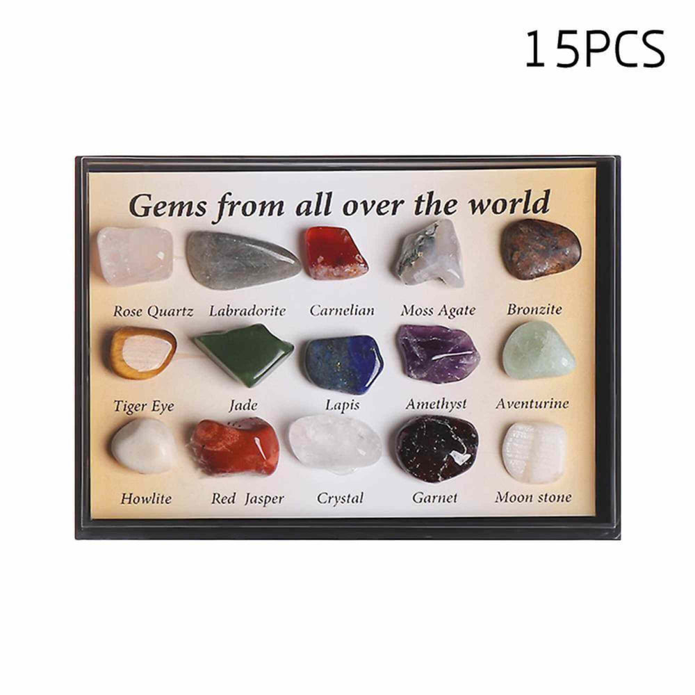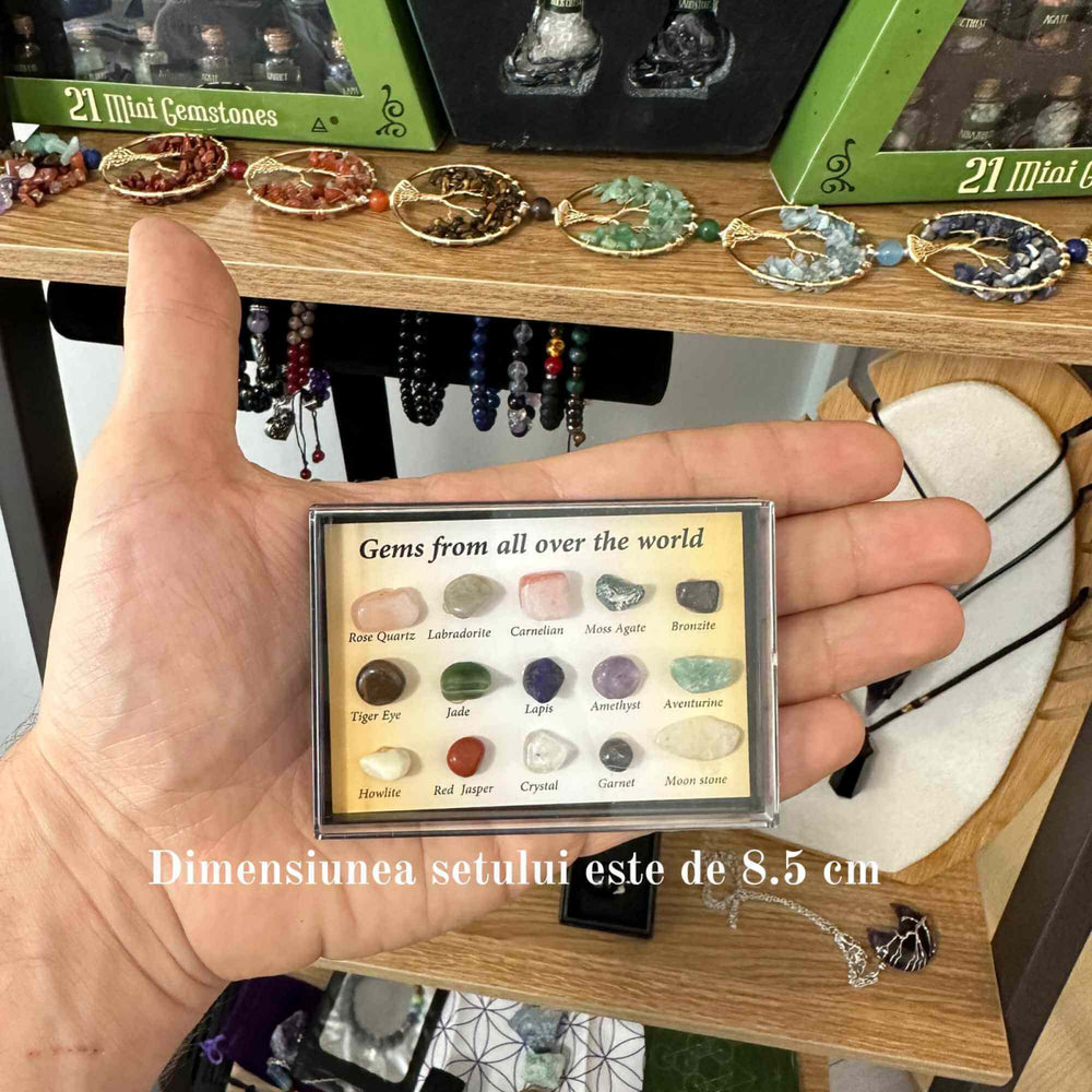 - Diversitatea gemelor: Setul nostru include 15 tipuri diferite de pietre semipretioase, cum ar fi Quartzul Roz, Labradoritul, Carneolul, Agatul Musgos, Bronzitul, Ochiul de Tigru, Jadul, Lapisul, Ametistul, Aventurinul, Howlitul, Jaspul Rosu, Cristalul, Granatul si Piatra Lunii. Fiecare piatra are propriile sale proprietati unice si beneficii.