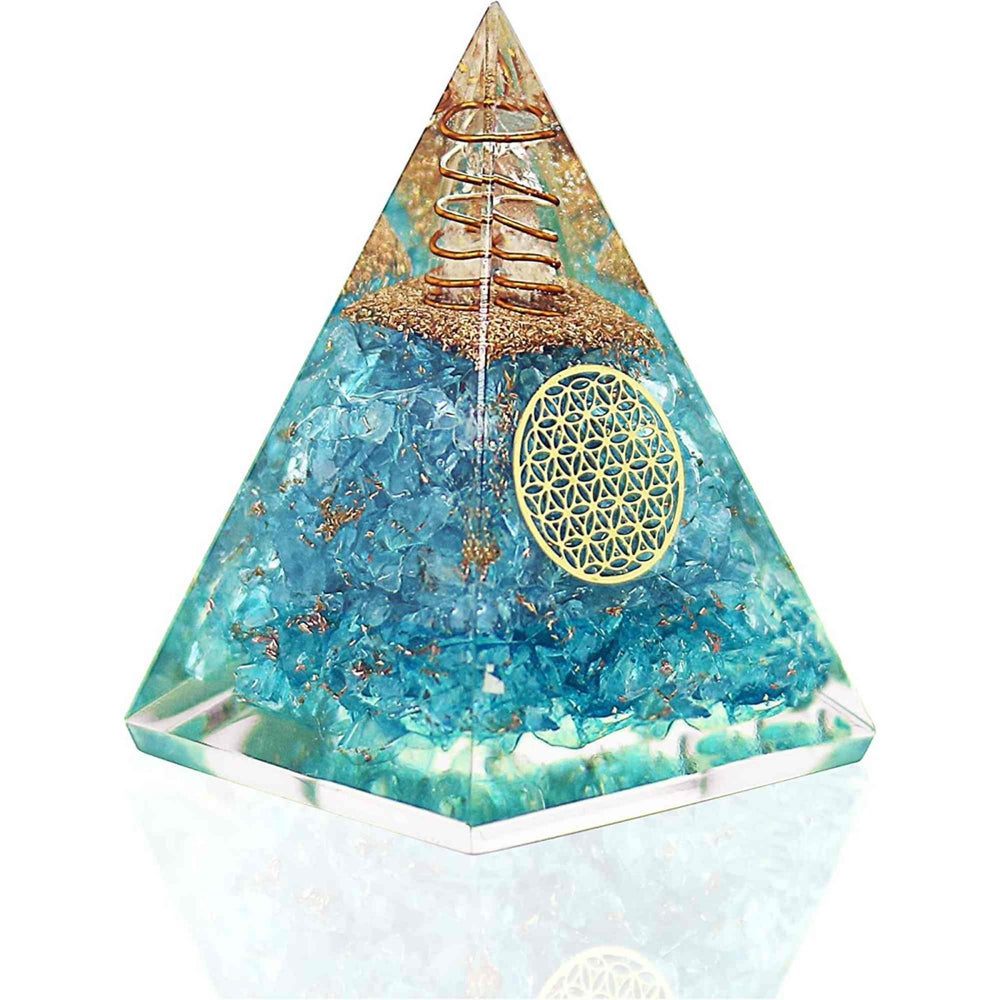 Piramida Orgonica cu cristal Acvamarin si simbolul floarea vietii 8 cm – pentru energie pozitiva, curaj, eliminarea fricii si a stresului