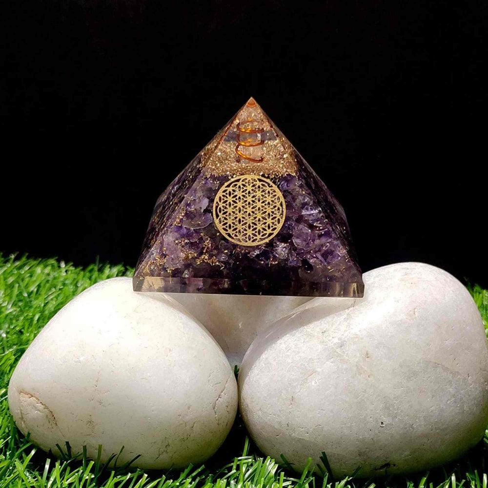 - Piramida de orgon este realizata manual in India din cristale naturale de ametist, rasina transparenta, bobina de cupru si simbolul floarea vietii. Ametistul este o piatra puternica si protectoare, amelioreaza stresul si calmeaza iritabilitatea, elimina furia, frica si anxietatea ;