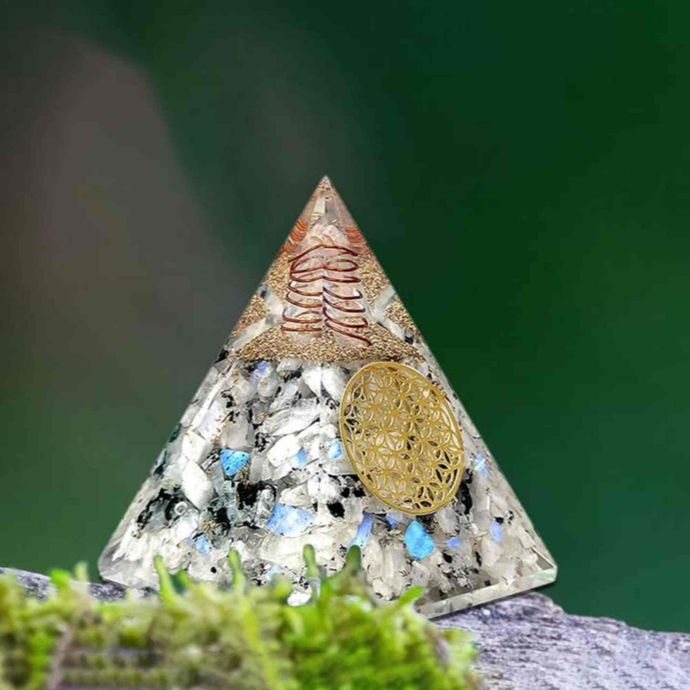- Elementul principal al acestei piramide este Piatra lunii curcubeu, o piatra pretioasa alba foarte puternica, cu luciu sidef. Incurajeaza speranta, sensibilitatea, intuitia si abilitatile psihice. Aduce abundenta si succes utilizatorului. De asemenea, ajuta la reglarea unui ciclu de somn sanatos si creste calmul general pentru o sanatate mintala mai buna;