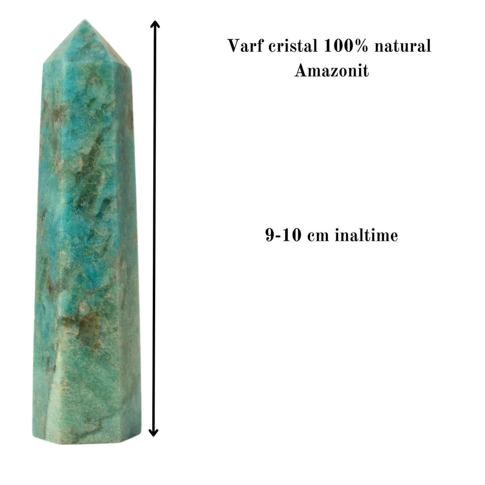 - Descopera frumusetea si puterea pietrei Amazonit, un cristal natural care imbina armonia, echilibrul si protectia. Acest turn din Amazonit, inalt de 9-10 cm, este o alegere ideala pentru a adauga un strop de eleganta si energie pozitiva in casa sau biroul tau;