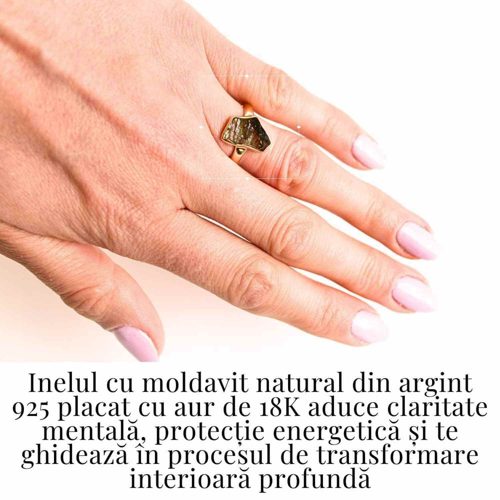 Inel cu Moldavit si montura argint 925 placat cu Aur 18K 2.96 gr Marime 53 (EU) / 6.5 (US) – Deschide-ti Drumul Schimbarii Interioare,