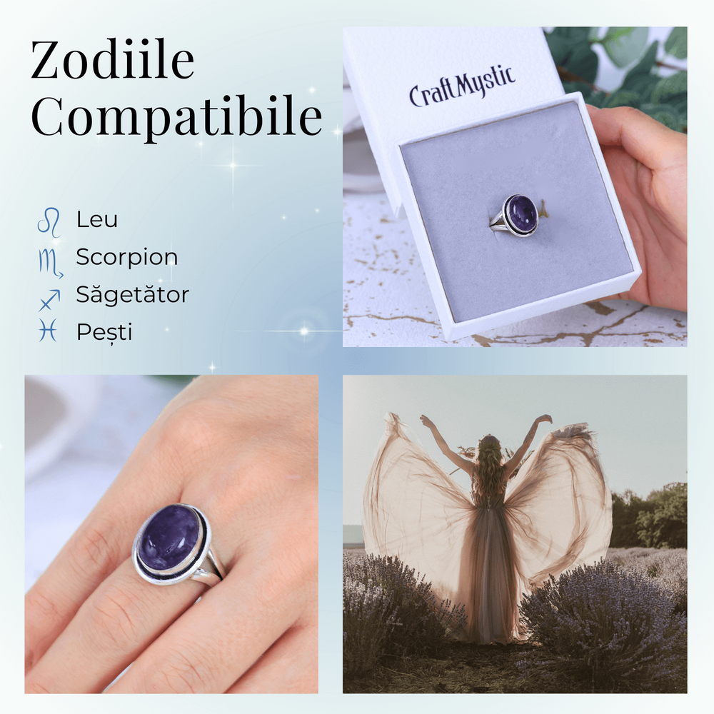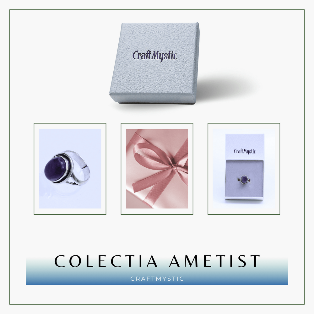 Fiecare piatră de Ametist este lucrată manual, ceea ce face ca fiecare inel să fie unic. Pot exista mici diferențe de culoare și textură față de imaginile prezentate, oferind fiecărei piese un farmec distinctiv și autentic. Produsul va fi livrat într-un săculeț de catifea sau o cutie cadou, gata pentru a fi oferit.
