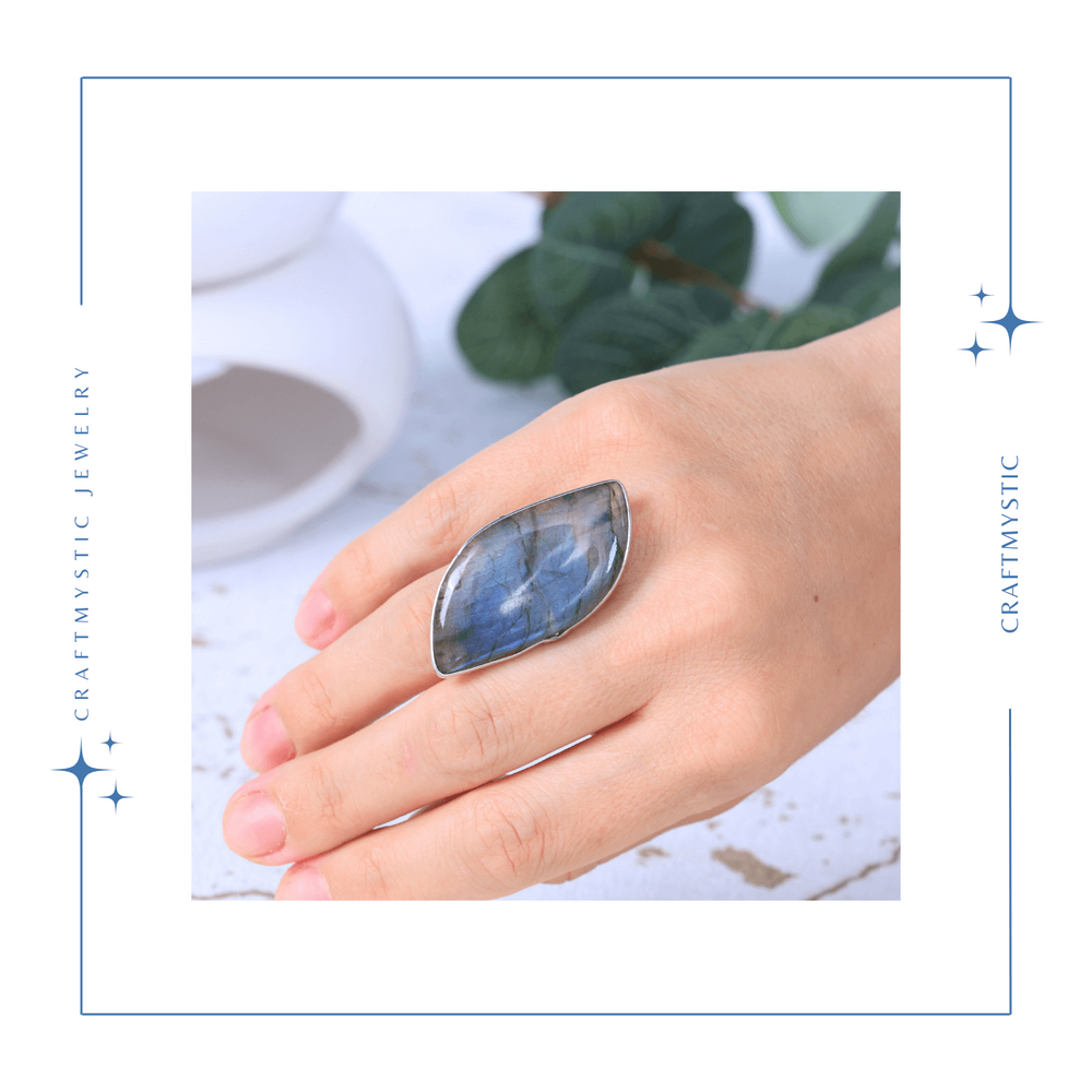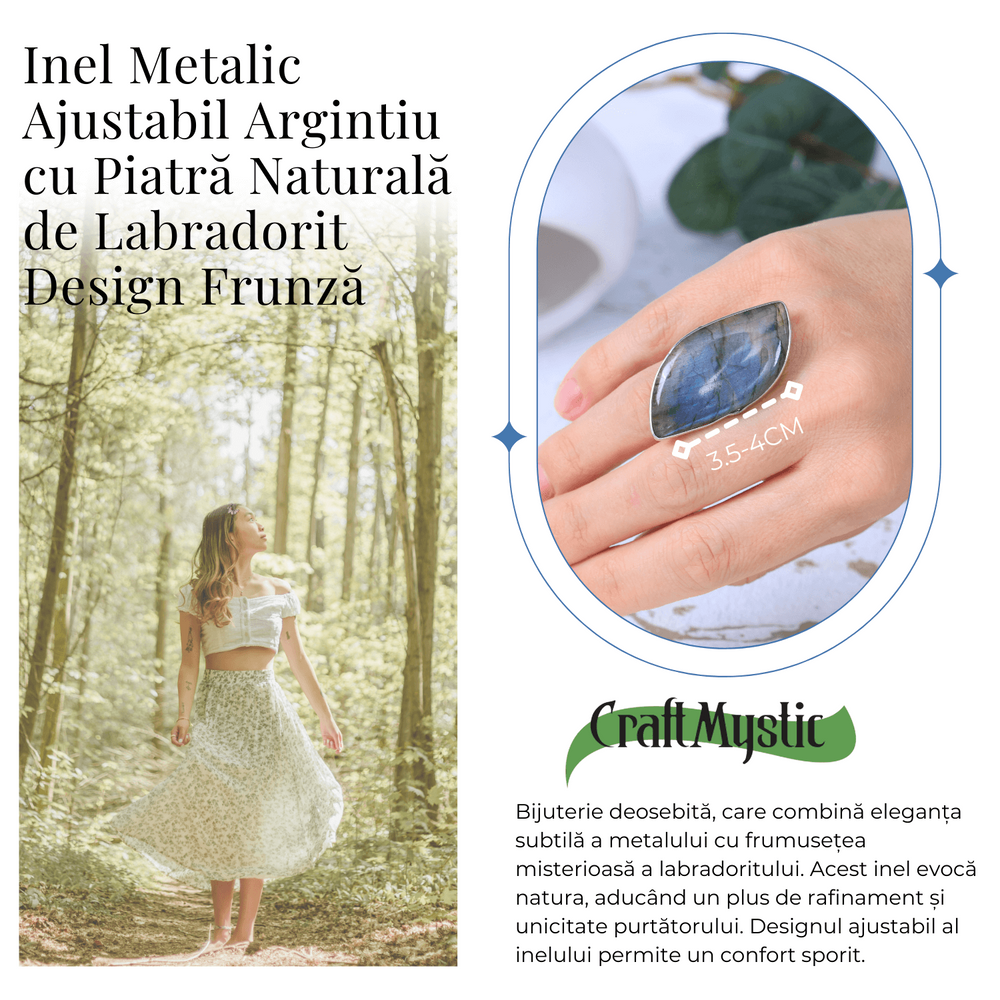 Inelul argintiu ajustabil cu Labradorit și design frunză nu este doar un accesoriu elegant, ci și un simbol puternic al protecției și intuiției. Cu o dimensiune a pietrei de 3.5-4 cm și ajustabilitatea inelului (mărimea minimă 59-60), acest produs este atât versatil, cât și confortabil. Metalul comun utilizat este rezistent la oxidare, garantându-i durabilitatea și păstrarea strălucirii.