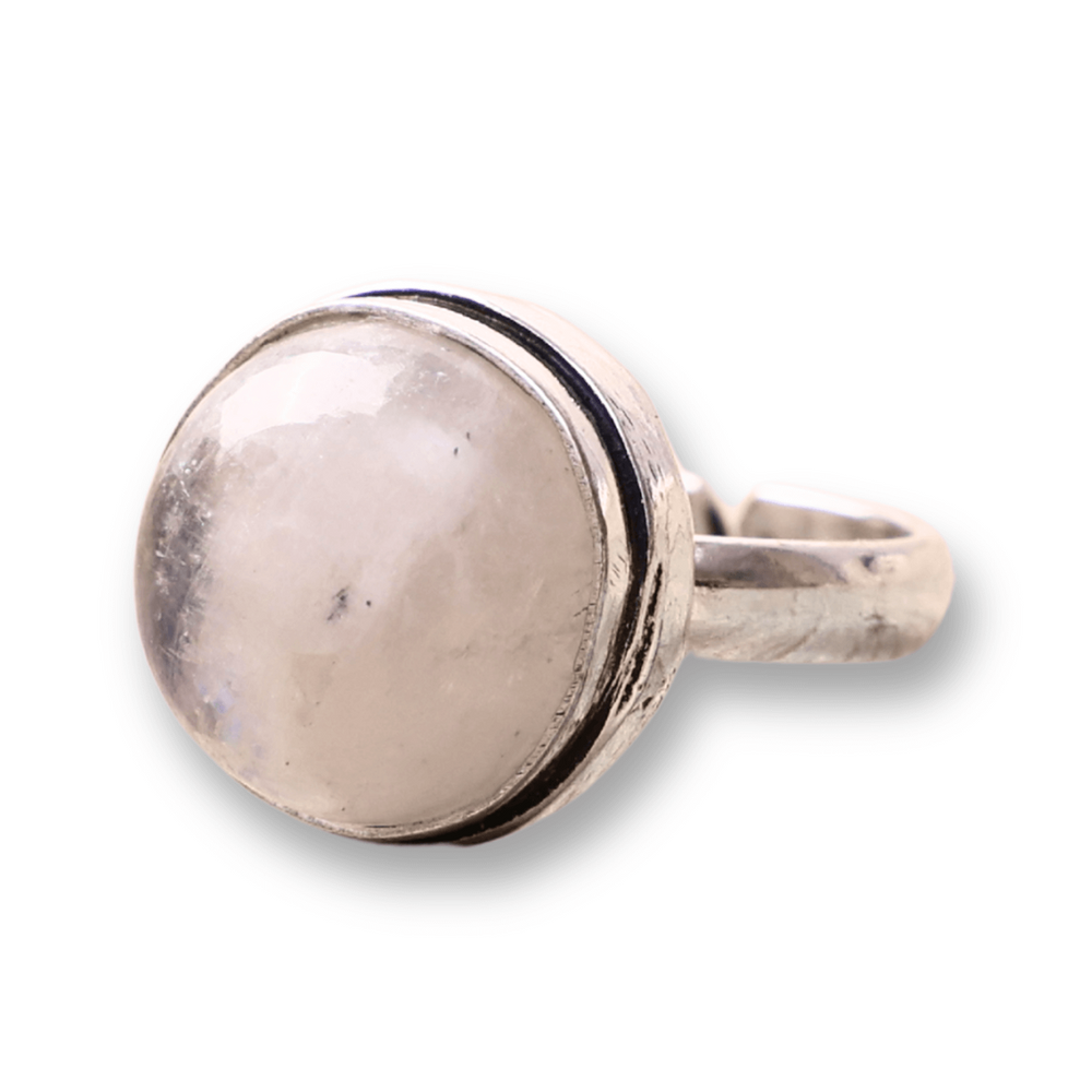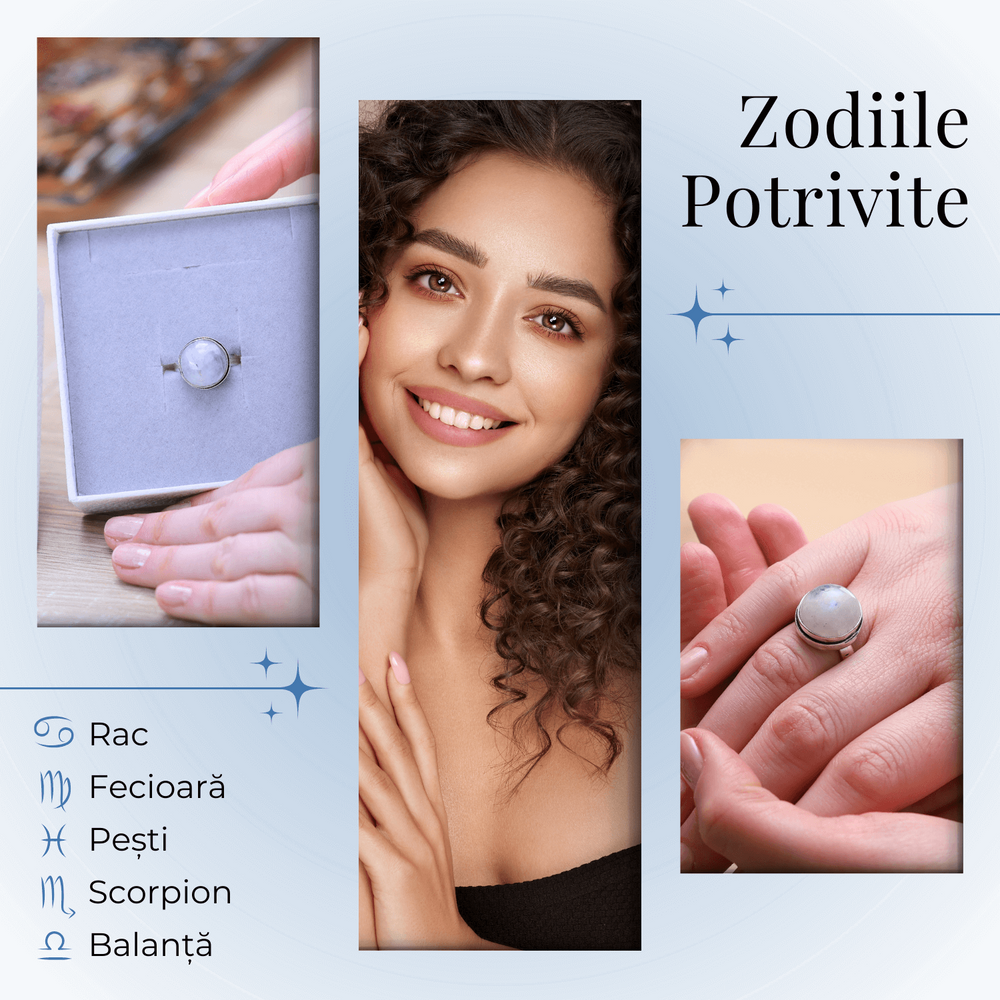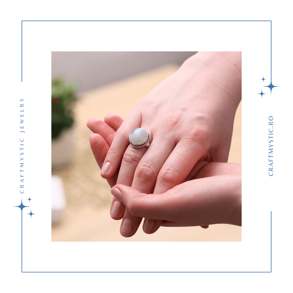 - Design Atractiv: Inelul prezinta o Piatra a Lunii Curcubeu, cunoscuta pentru nuantele sale schimbatoare si captivante, montata pe o baza argintie ajustabila.