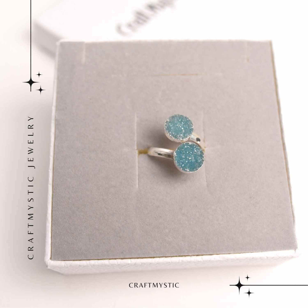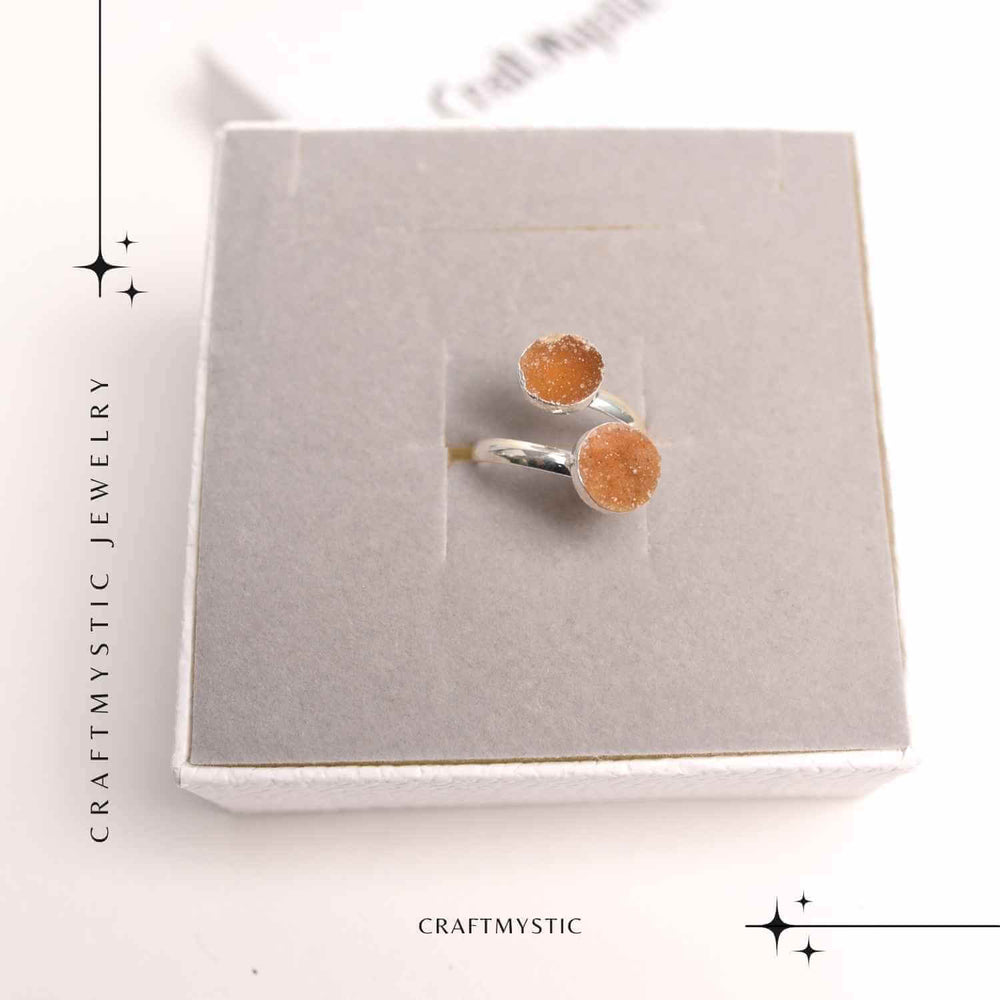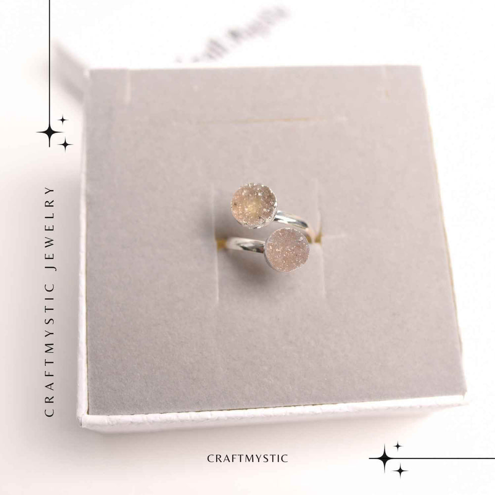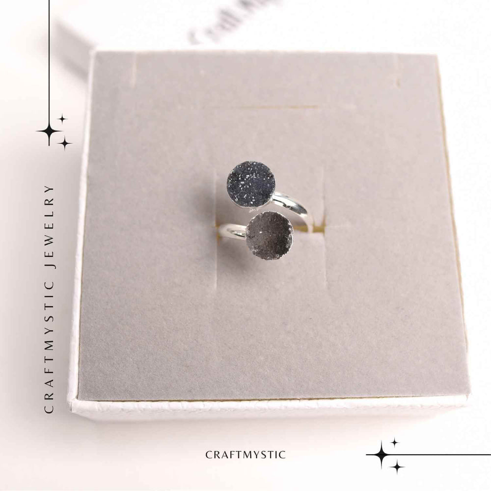 Acest inel argintiu cu dublu agat druzy tratat termic este ideal pentru cei care apreciază bijuteriile unice și versatile. Disponibil în nuanțe variate (gri, albastru, roz, crem sau portocaliu), fiecare inel este unic, iar culoarea exactă va fi aleatorie, conform selecției clientului. Pietrele de 8 mm sunt atent montate pe un suport din alamă combinată cu cupru placat argintiu pentru o protecție excelentă împotriva oxidării.