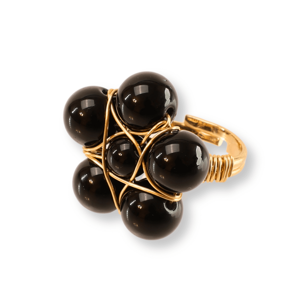 Inel Model Floare Metal Auriu cu Pietre din Obsidian