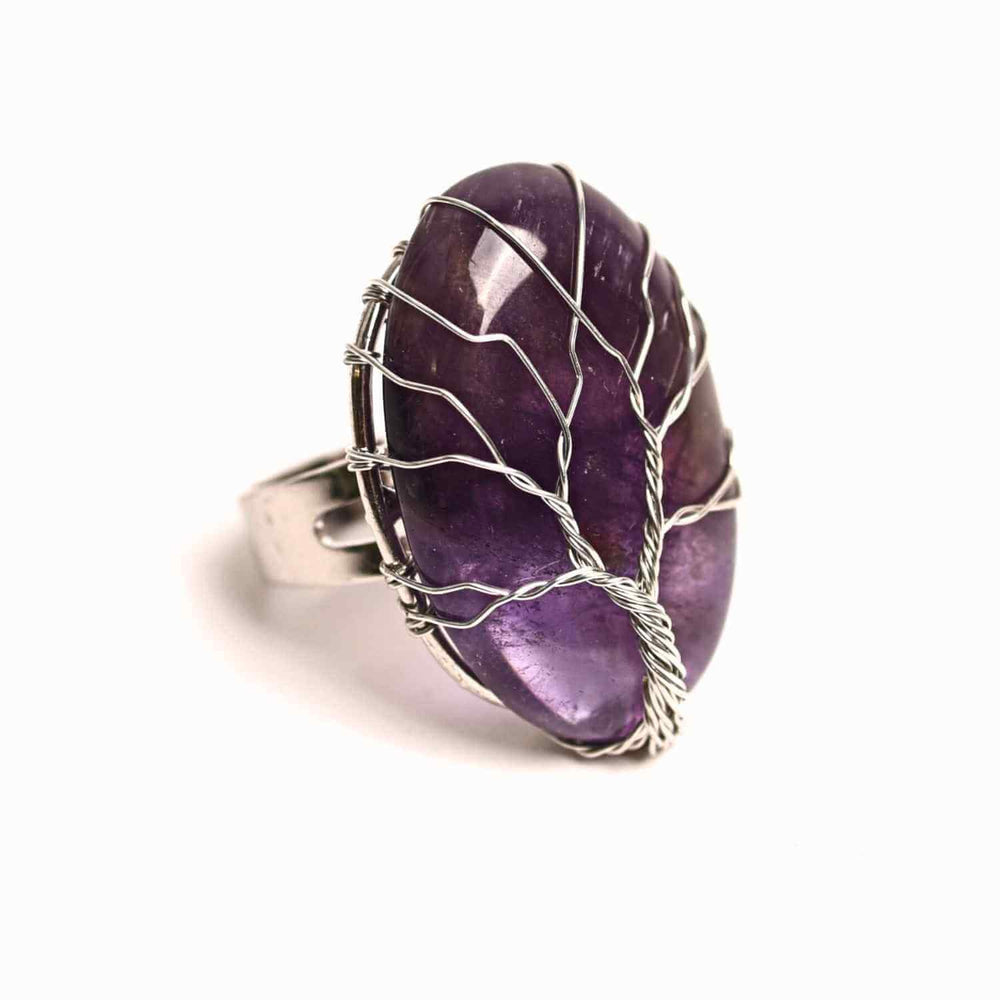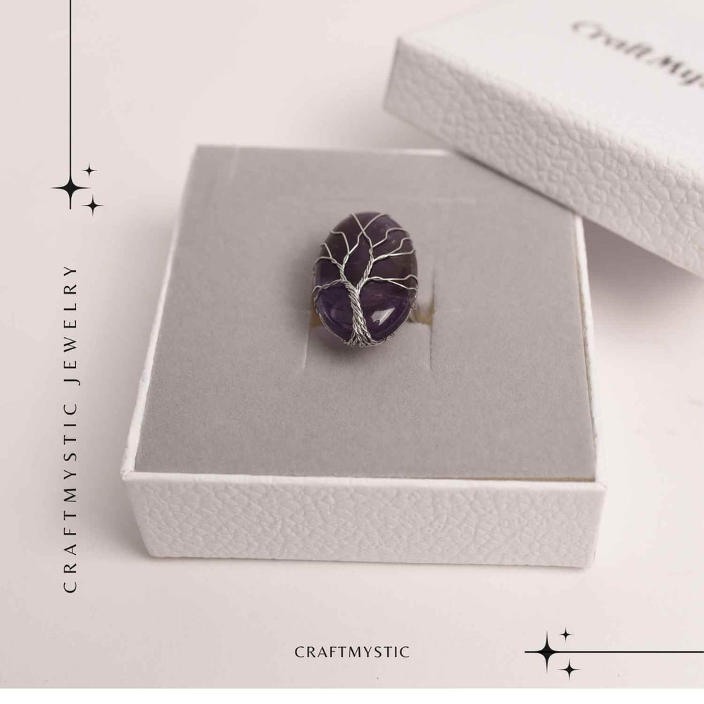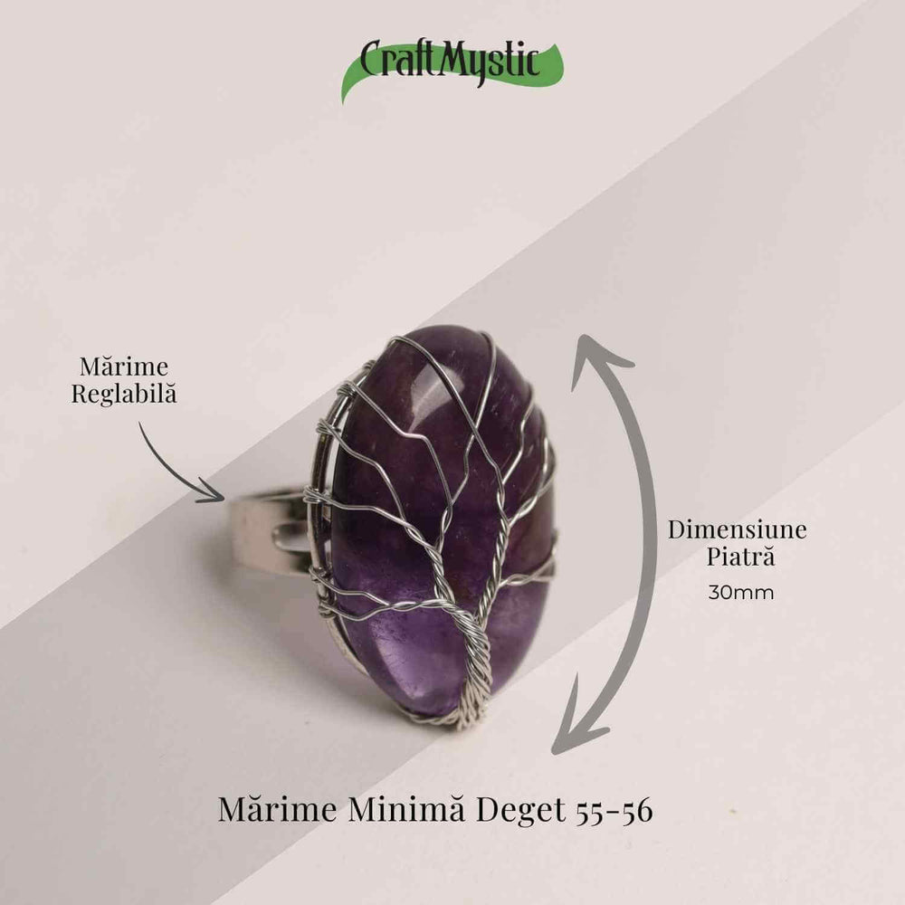 Descoperă beneficiile calmului și echilibrului spiritual cu acest inel unic de ametist, împodobit cu Arborele Vieții pentru o conexiune profundă cu natura.